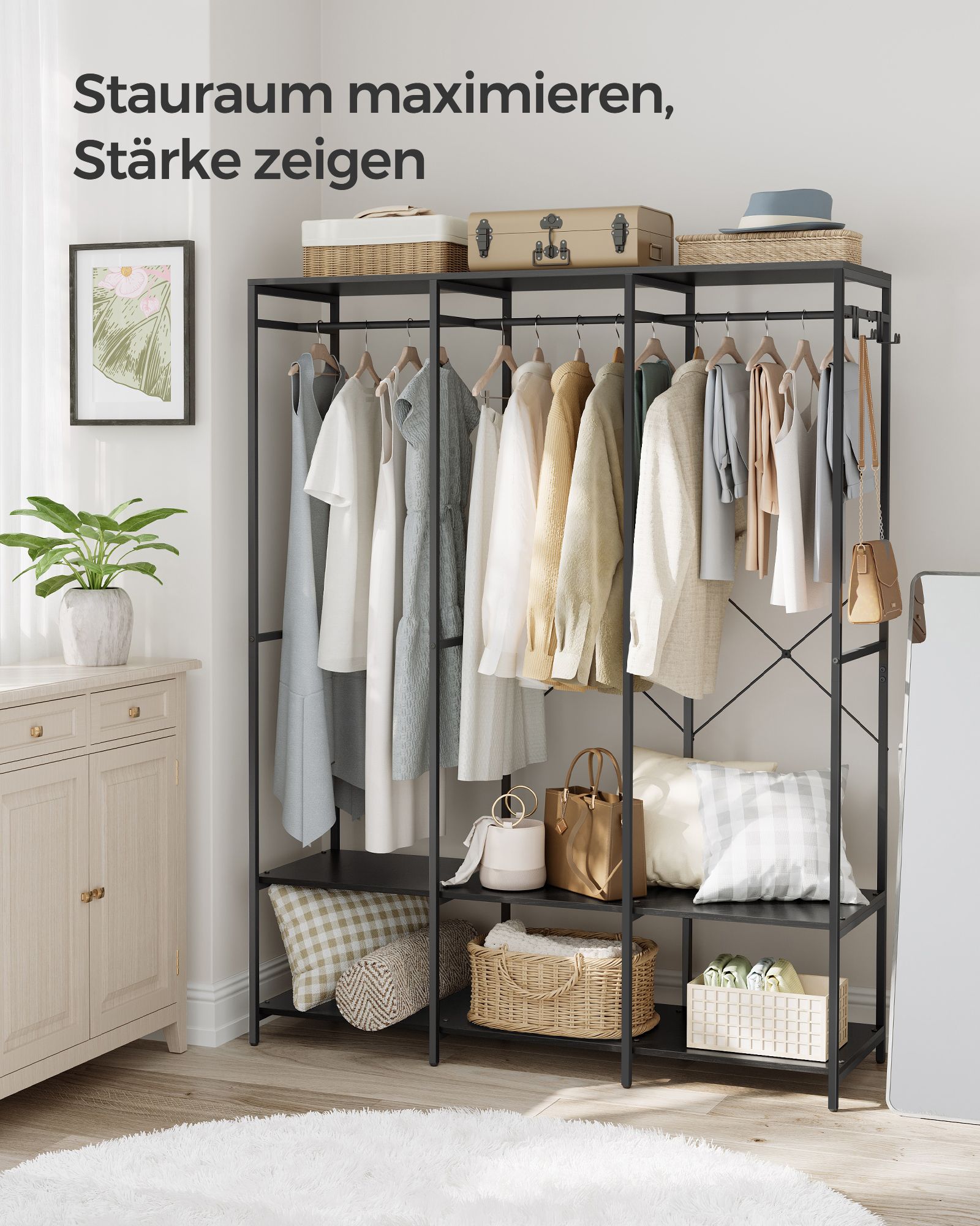 Tøjskabet er konstrueret med en robust metalramme og tykke partikelbrædder, der sikrer langvarig holdbarhed. Forstærkede X-stænger på bagsiden tilføjer ekstra stabilitet, så dette tøjskab kan bære op til 196 kg. Du kan trygt hænge dine tunge vinterjakker og andet tøj op uden at bekymre dig.