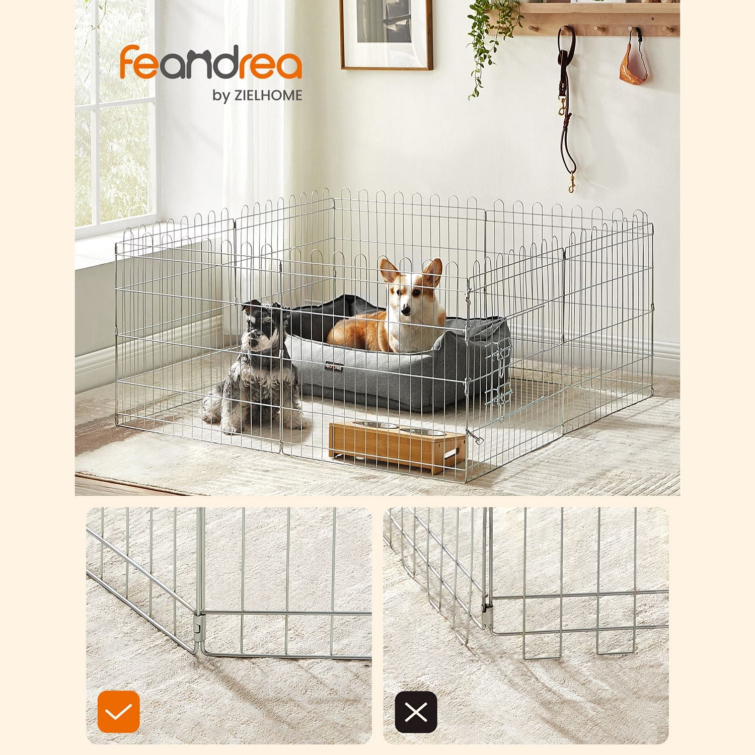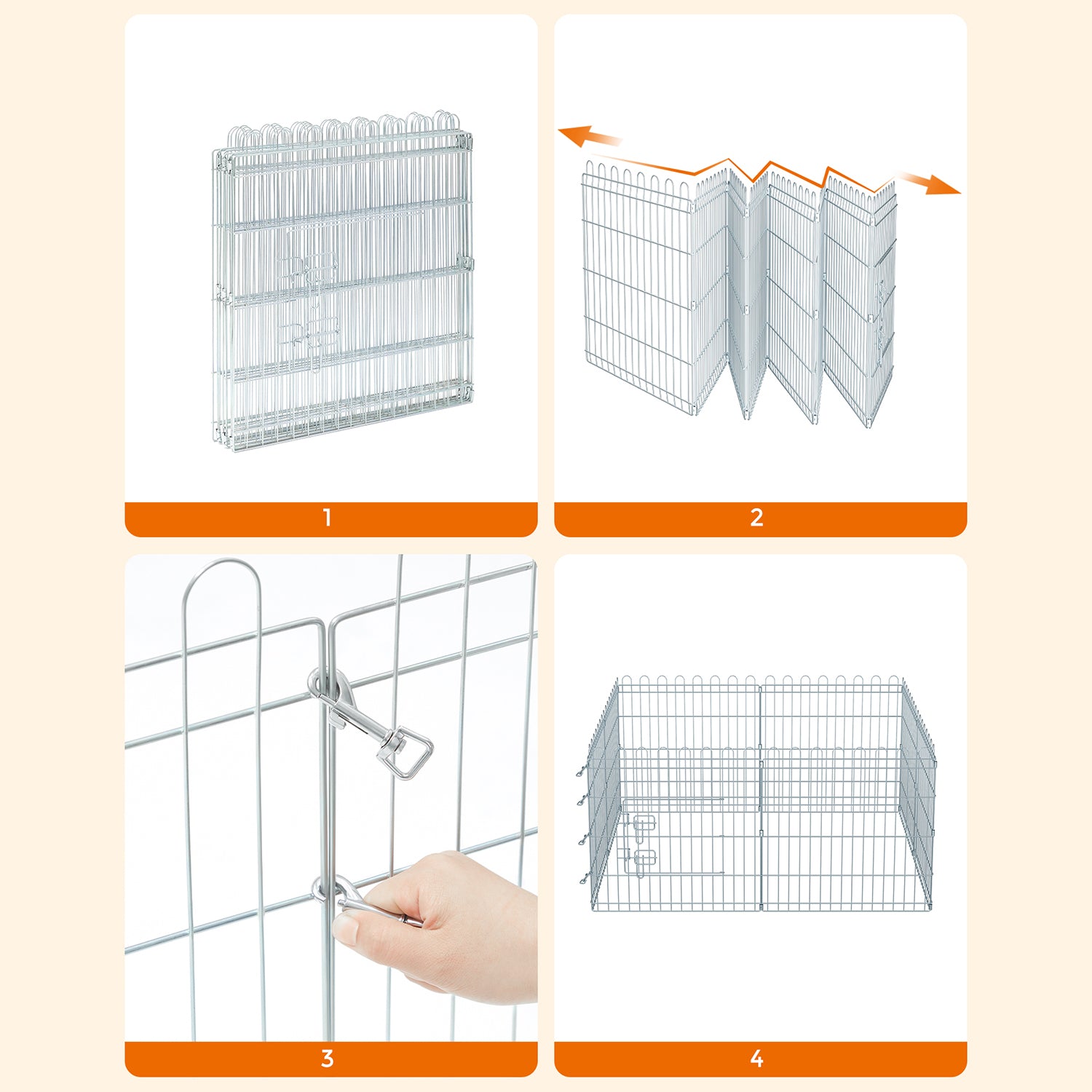 Denne DIY kæledyrsindhegning består af 8 hegnspaneler, som du kan samle i forskellige former, såsom en firkant eller en ottekant, afhængigt af dit behov. Med en højde på 61 cm passer den perfekt til dyr op til 40 cm, som hunde, kaniner og kyllinger, hvilket giver dem et sikkert og hyggeligt område.