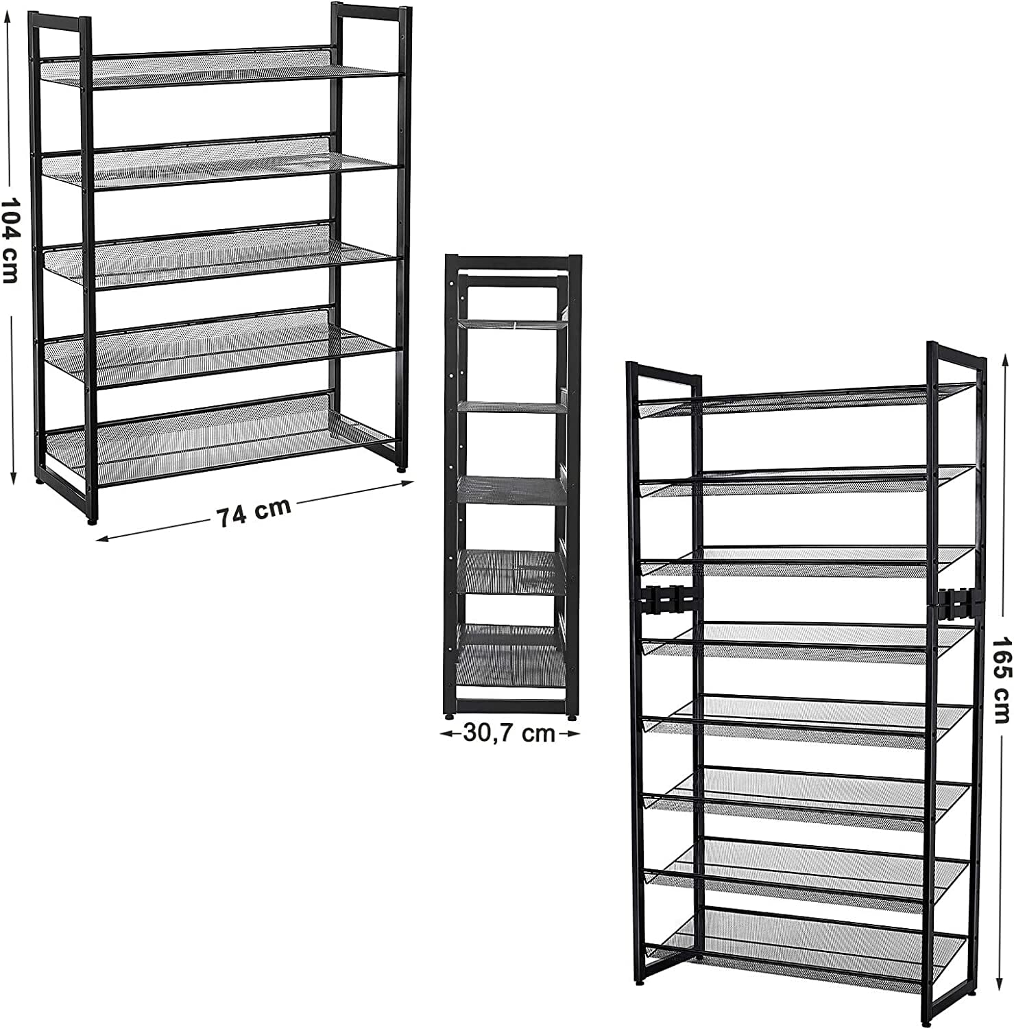 Holdbar konstruktion: Lavet af pulverlakerede jernrør for pålidelig styrke og stabilitet. Måler 74x104x30,7 cm (B x H x D) med en nettovægt på 5,7 kg for ekstra stabilitet. Inkluderer 2 plastikforbindelser til nem udvidelse, hvis det ønskes.