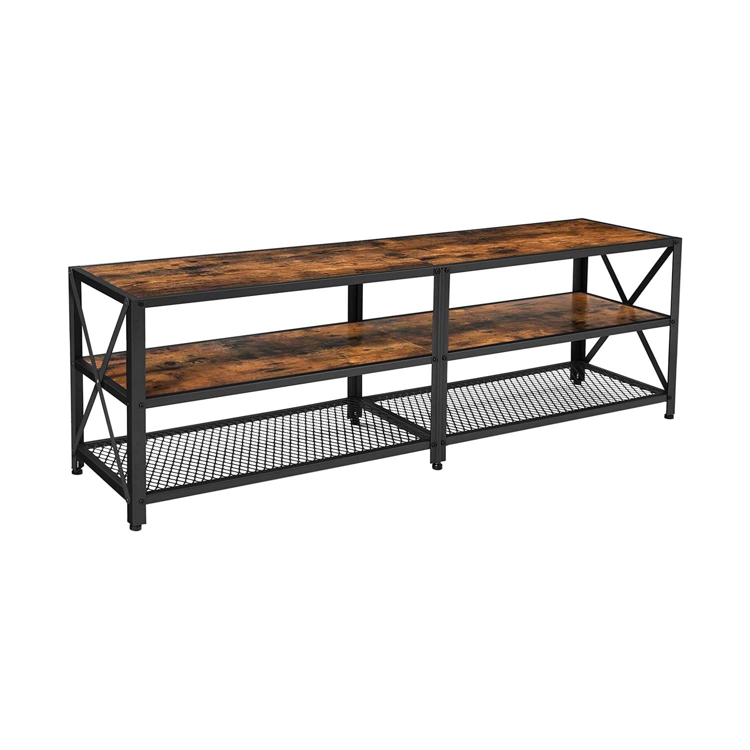 Sæt dit store tv op til 70 tommer op på denne robuste tv-stativ. Den stærke stålramme giver pålidelig støtte med en belastningskapacitet på 60 kg pr. hylde, mens de rustikke brune hylder og de stilfulde mat sorte scener skaber en hyggelig atmosfære til familiens filmaften.