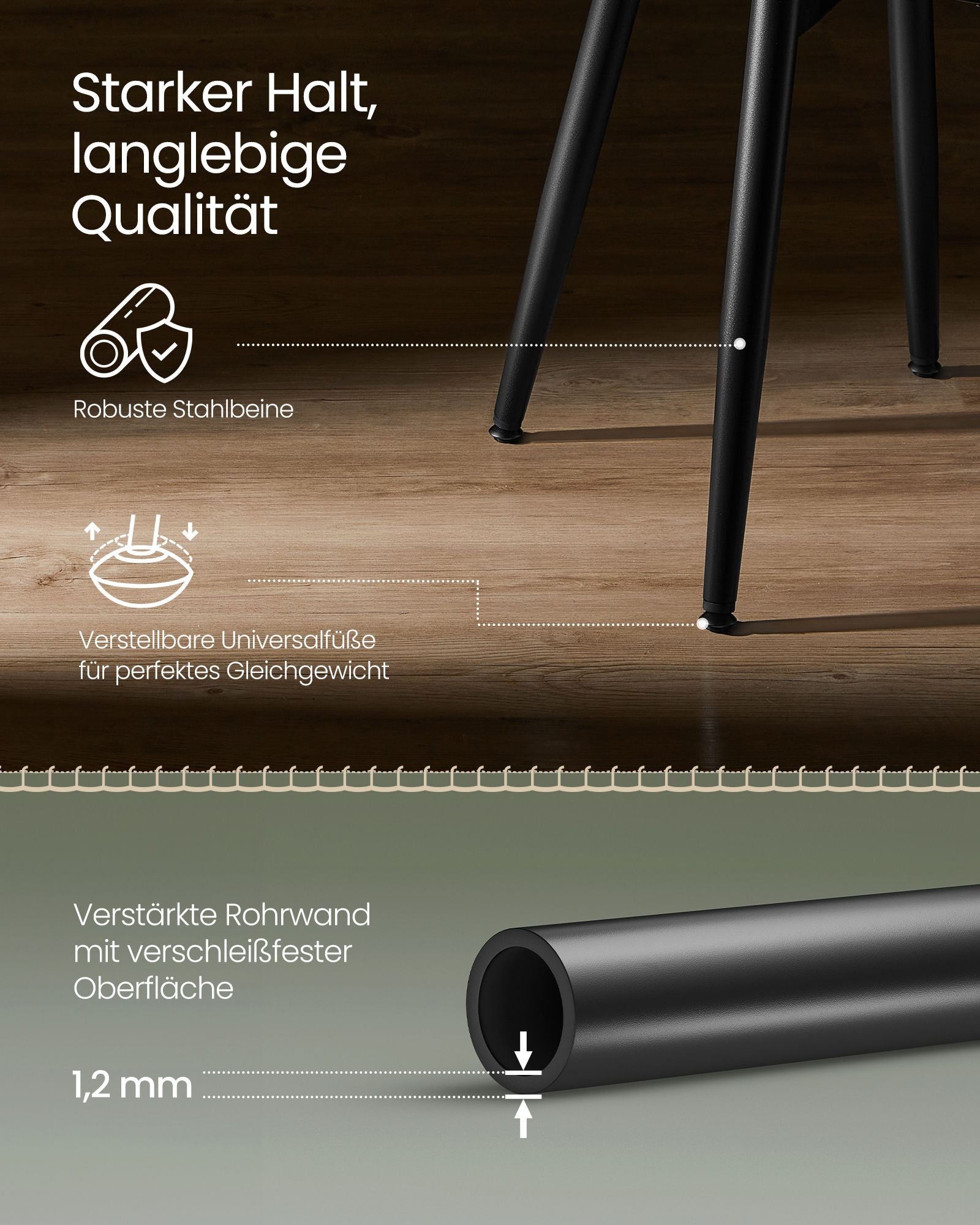 Spisebordsstolen har en solid base med metalben, der står udad og giver høj stabilitet. De justerbare universalfødder sikrer, at stolen forbliver stabil på ujævne overflader, samtidig med at de beskytter gulvet mod ridser. Du kan være tryg ved, at denne stol vil holde godt, selv ved daglig brug.