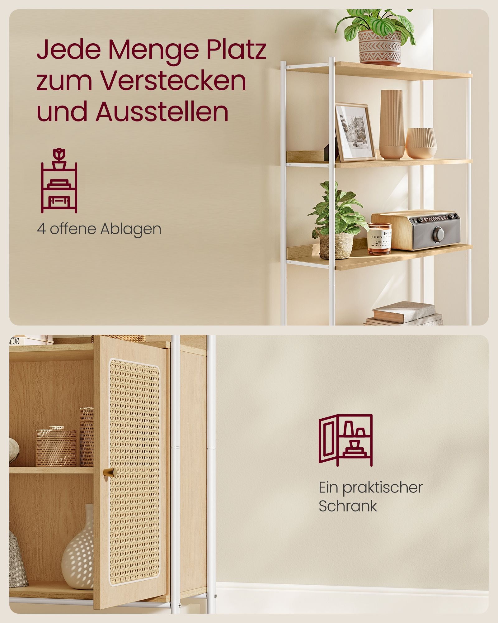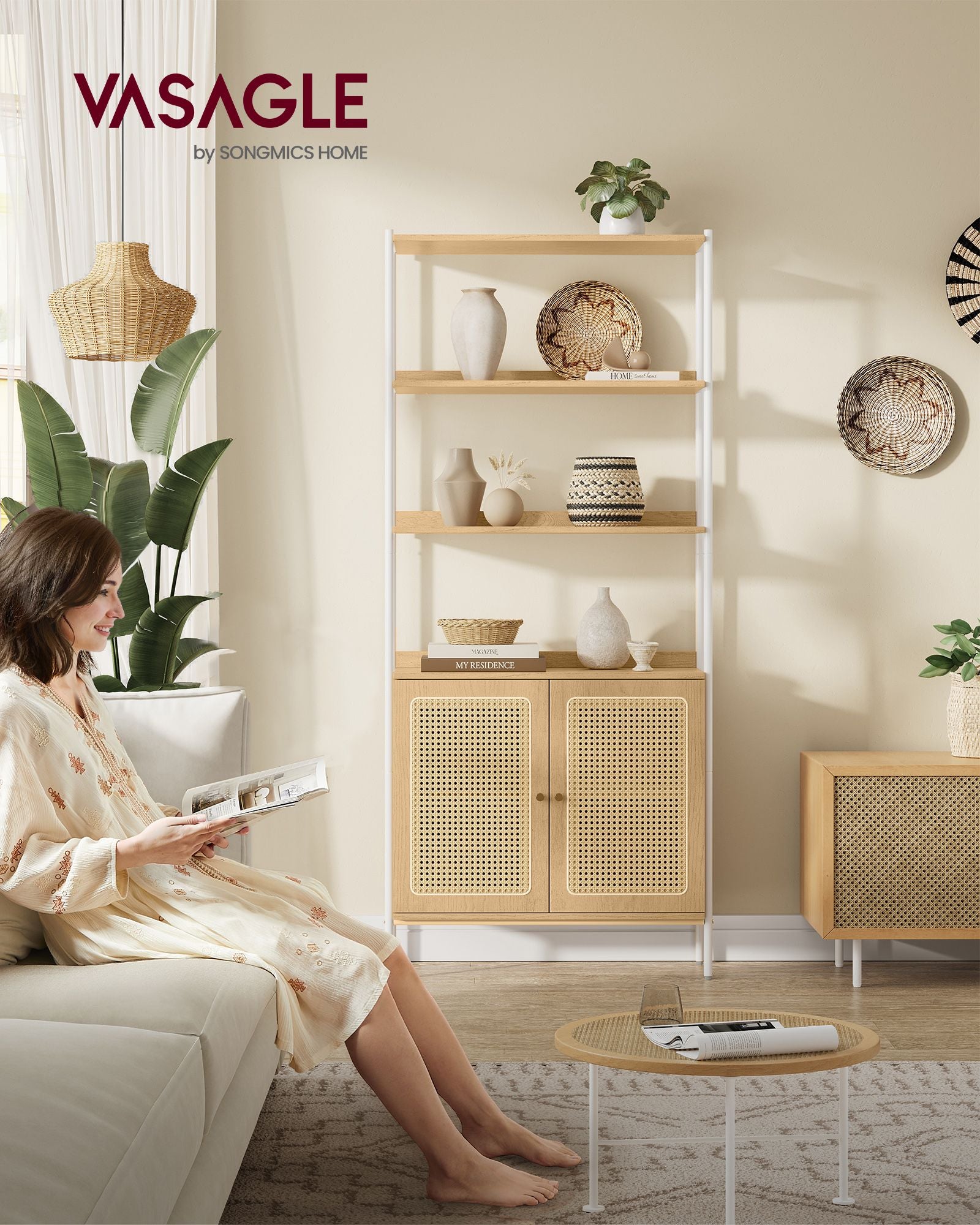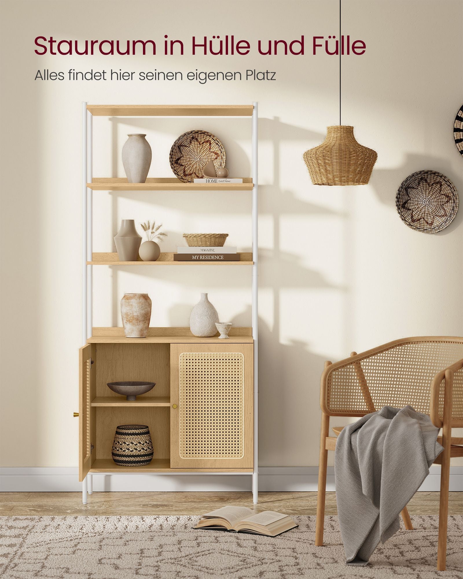 Skab en hyggelig og afslappet atmosfære i dit hjem med disse boho-inspirerede reoler. Med en varm jordnær farvepalet og rattan-lignende skabslåger, tilføjer denne reol et luftigt og afslappet touch, der både løfter ethvert moderne rum og kompletterer en boho-indretning. Denne kombination af stil og funktion gør reolen til det perfekte valg for dem, der ønsker at tilføje en følelse af hygge og charme i deres hjem.