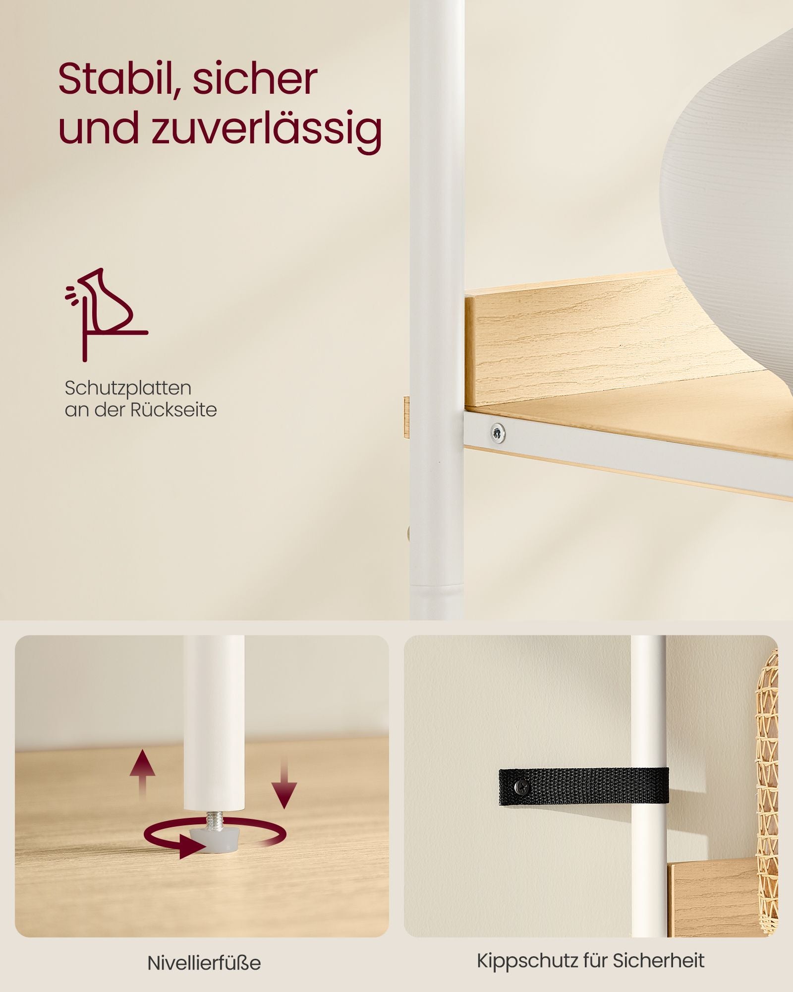 For at sikre, at din reol står stabilt og sikkert, selv på ujævne gulve, er den udstyret med justerbare fødder. Derudover medfølger et anti-tip kit, som gør det muligt at fastgøre reolen til væggen, hvilket øger sikkerheden i hjemmet. Bagpanelerne forhindrer også, at genstande falder ud, så dine ejendele forbliver sikre og på plads.