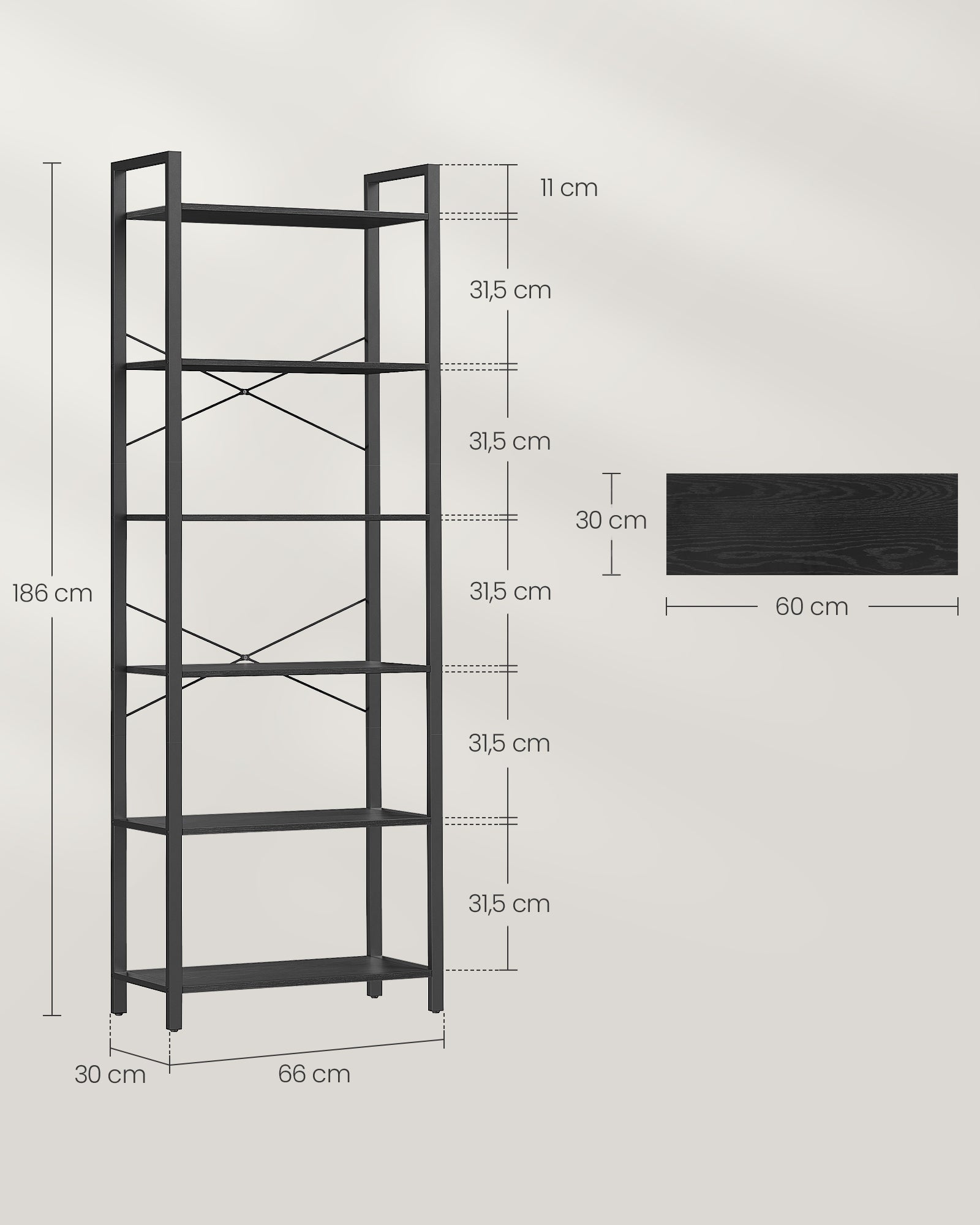 Denne høje reol på 186 cm med seks åbne hylder giver dig masser af plads til at udstille dine yndlingsbøger, dekorationer og planter. Uanset om du placerer den i stuen, soveværelset eller på kontoret, tilbyder denne reol en stilfuld og funktionel opbevaringsløsning, der hjælper med at organisere dit hjem. Med sine kompakte mål på 30 x 66 cm passer den perfekt ind i små som store rum.