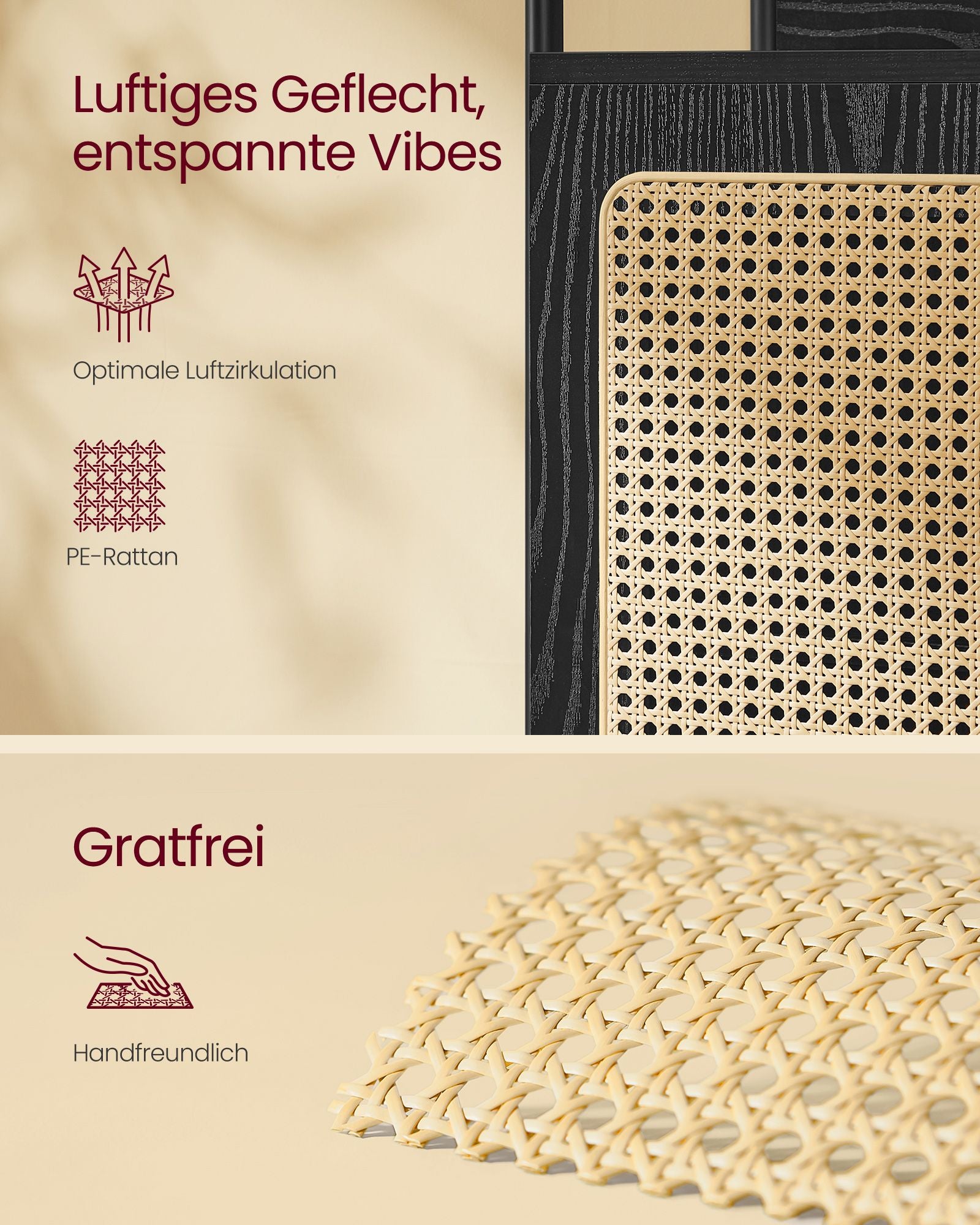 Oplev den perfekte blanding af moderne design og boho charme med disse reoler. Den beroligende sorte farvepalet kombineret med rattan-lignende skabslåger giver et luftigt, afslappet udtryk, der løfter ethvert moderne hjem. Disse reoler er ikke bare smukke, men også funktionelle, hvilket gør dem til det ideelle valg for dem, der ønsker både stil og praktisk opbevaring.
