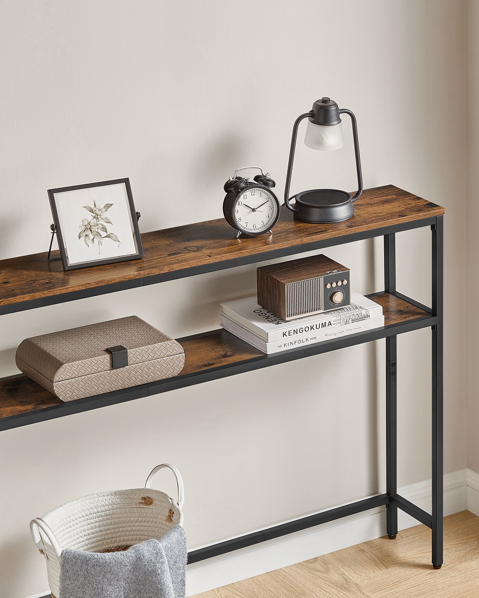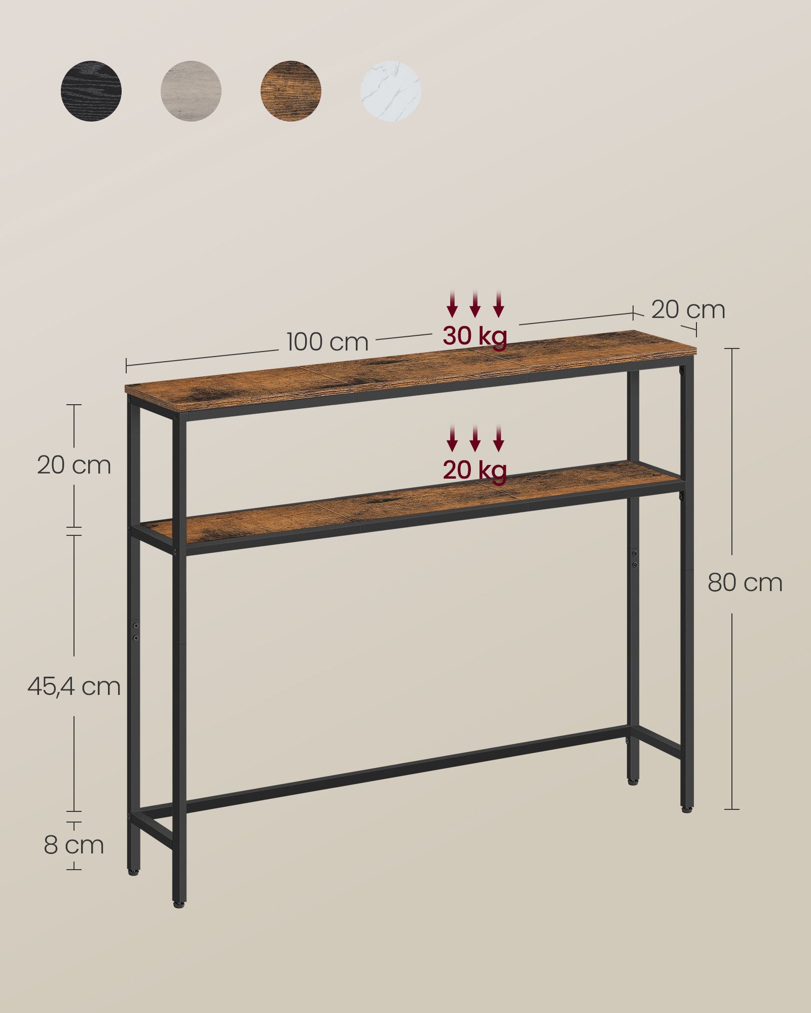 Med sine mål på 20 x 100 x 80 cm er dette smalle konsolbord ideelt til mindre rum. De to praktiske hylder giver god plads til bøger, planter og hverdagsting, så du nemt kan holde hjemmet ryddeligt og organiseret.