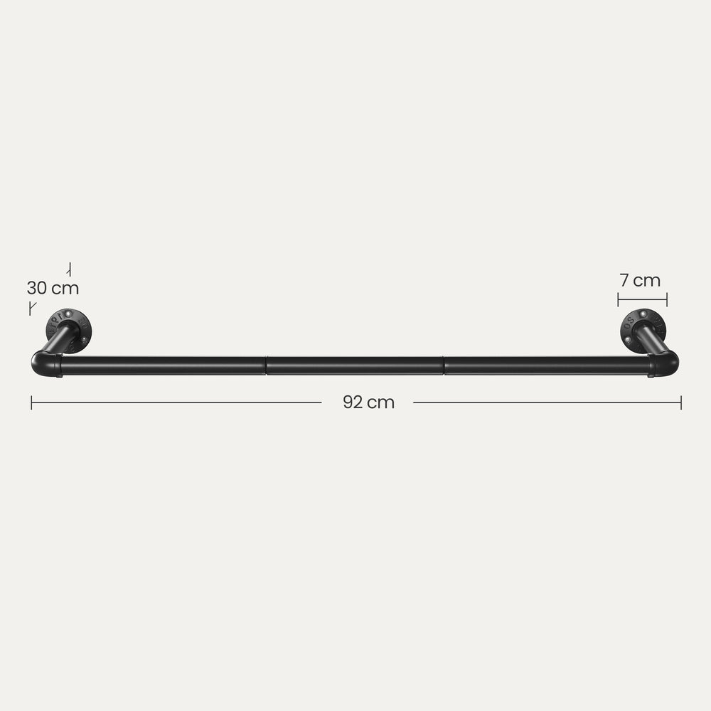 Specifications:- Colour: Black- Material: Steel- Product Size of Each Rack: 92 x 30 x 7.5 cm (L x W x H)- Product Weight of Each Rack: 1.3 kg- Max. Static Load Capacity per rod When Mounted on Solid Brick or Concrete Walls: 60 kg- Max. Static Load Capacity per rod When Mounted on Wooden Walls: 45 kgPackage Contents:- 2 x Clothes Rack- 2 x Accessory Bag- 1 x Instructions