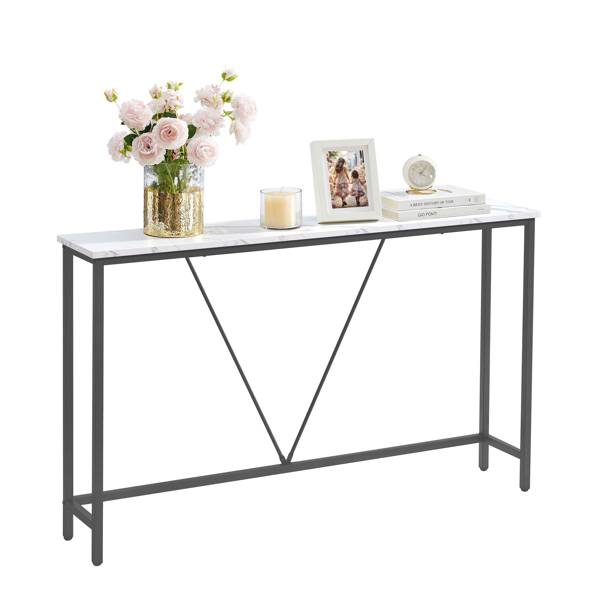 Dette smalle konsolbord forener rene linjer med matte sorte ståldetaljer og giver dit hjem et stilfuldt, urbant udtryk.