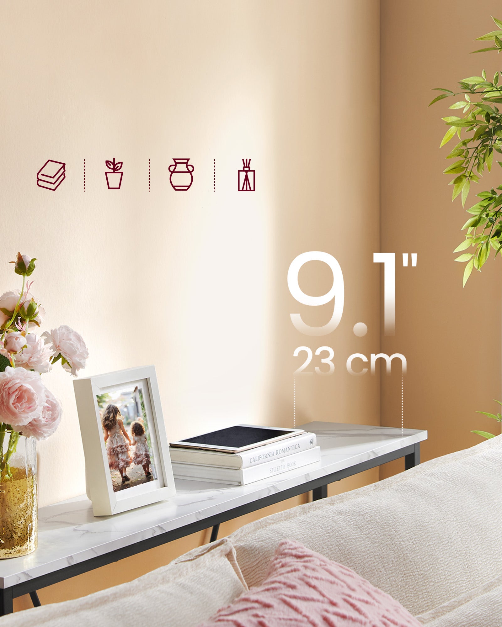 Med en dybde på kun 23 cm er bordet ideelt til smalle områder, hvor det giver ekstra opbevaringsplads uden at optage meget gulvplads.