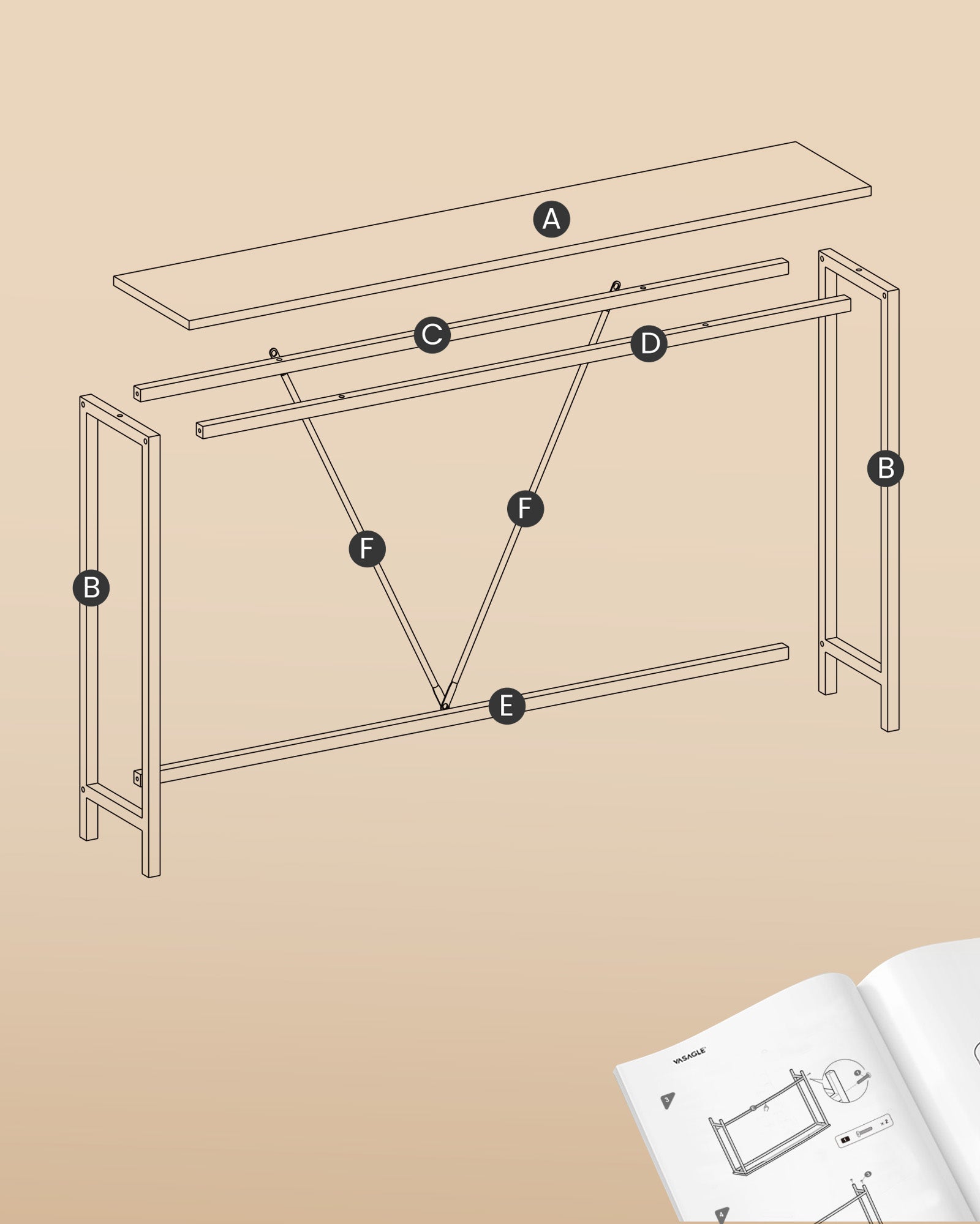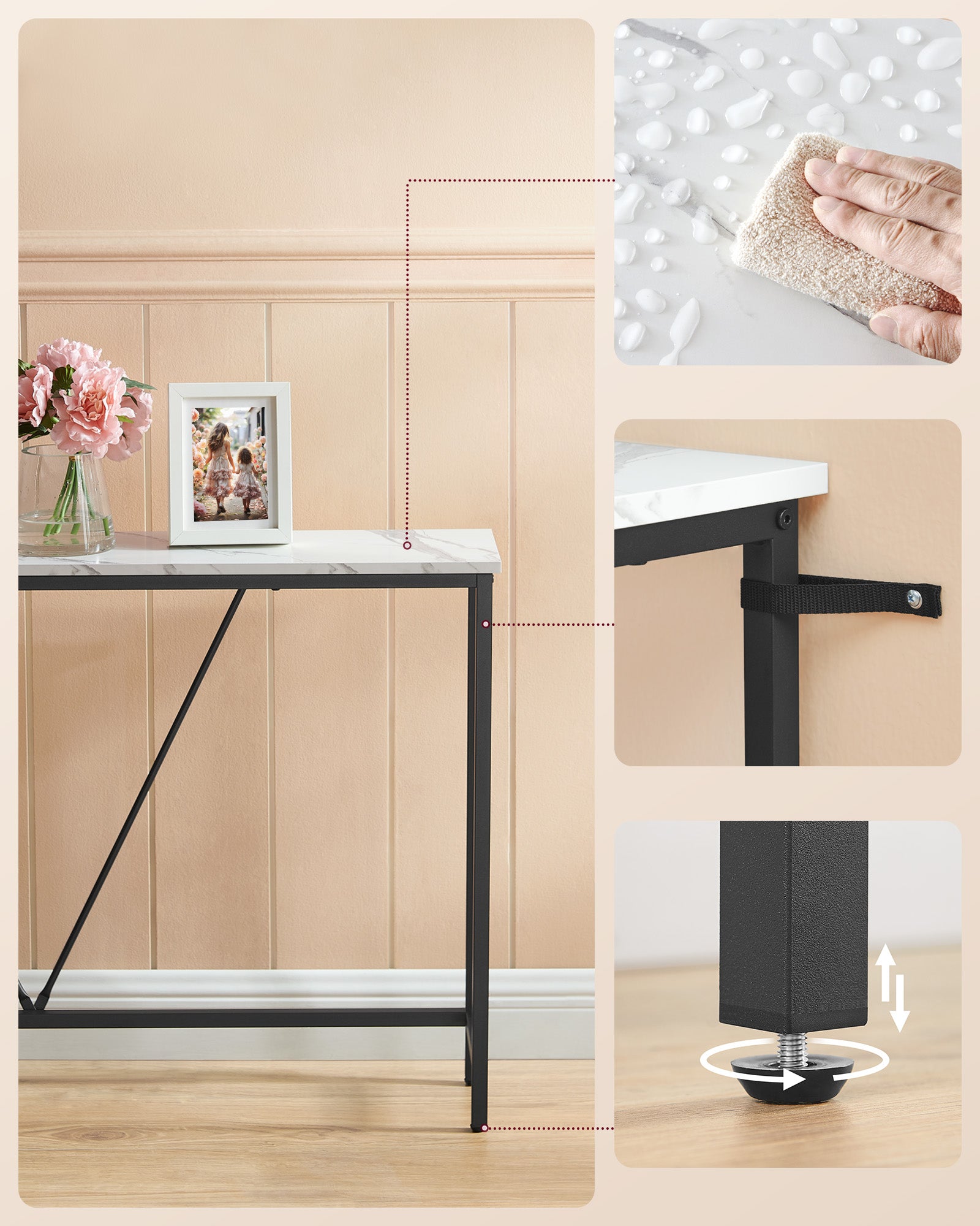 Med tydeligt markerede dele og en enkel vejledning kan du samle konsolbordet hurtigt og komme i gang med at indrette med det samme.