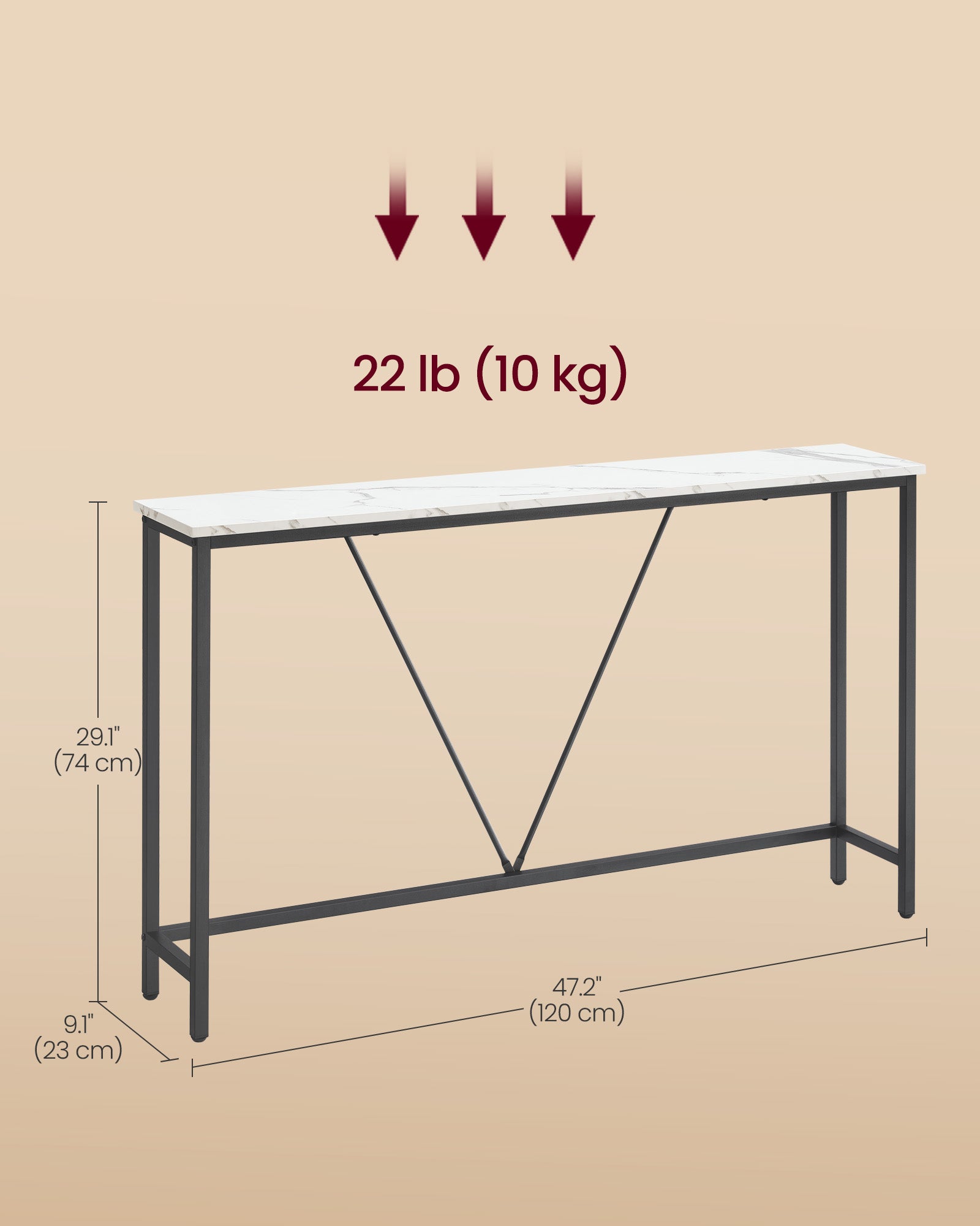 Med målene 23 x 120 x 74 cm kombinerer dette smalle konsolbord en robust spånplade med en forstærket stålramme. Dets justerbare fødder sikrer , at bordet står stabilt – selv på ujævne gulve.