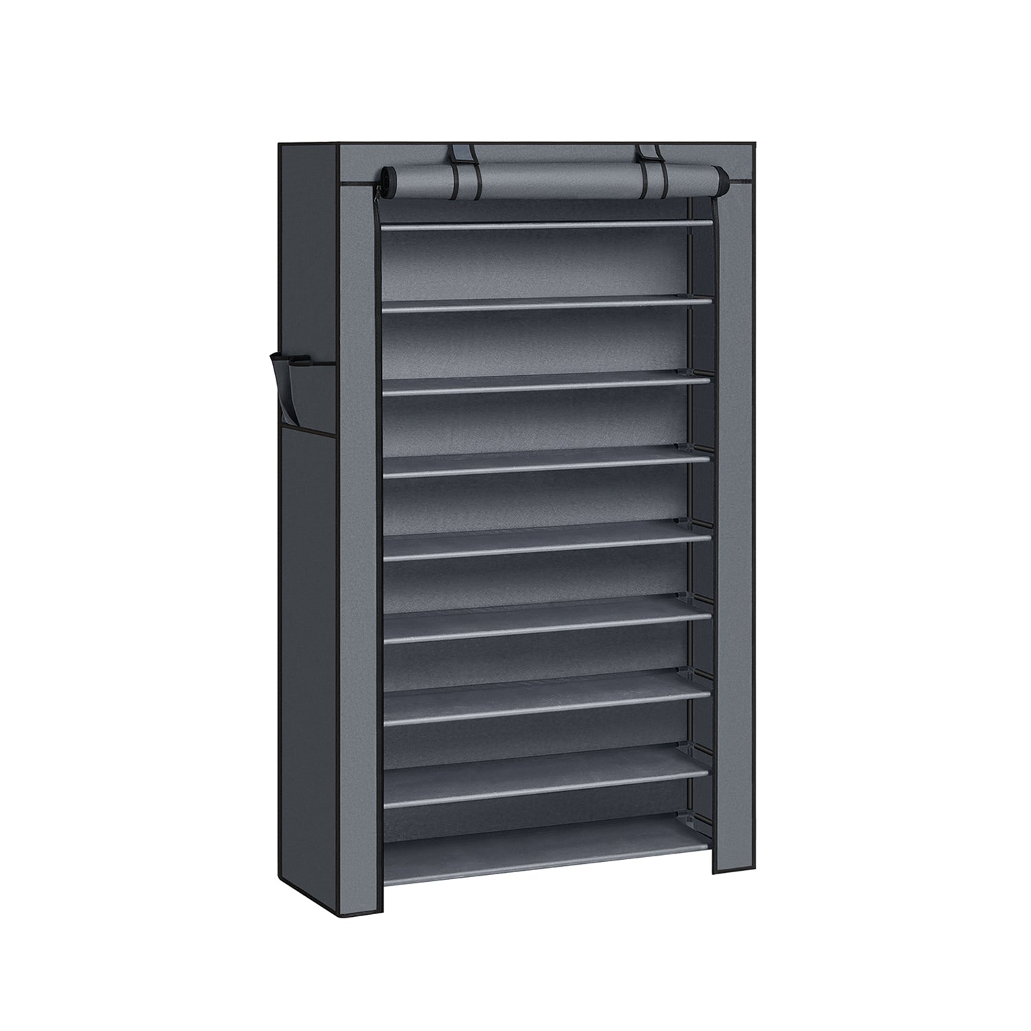 En robust skoreol med 10 hylder med et overtræk, nem samling og et tilpasningsdygtigt design, og en løsning til at tøjle de sko, der ligger spredt hen over entréen og walk-in skabet