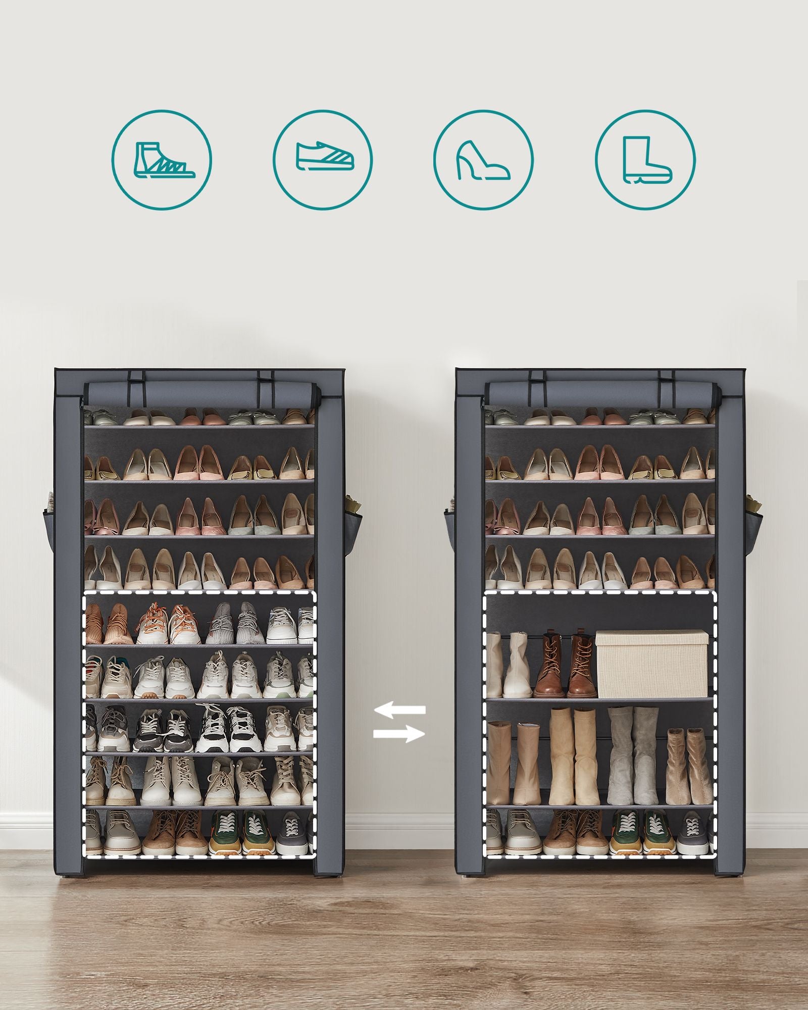 Vil du give dine sarte sko mere beskyttelse? Ingen problemer, vi har din ryg! Ja, stofbeklædningen på skoreolen er udstyret med lynlås og velcrobånd og er nøje udvalgt til at opbevare dine sko korrekt