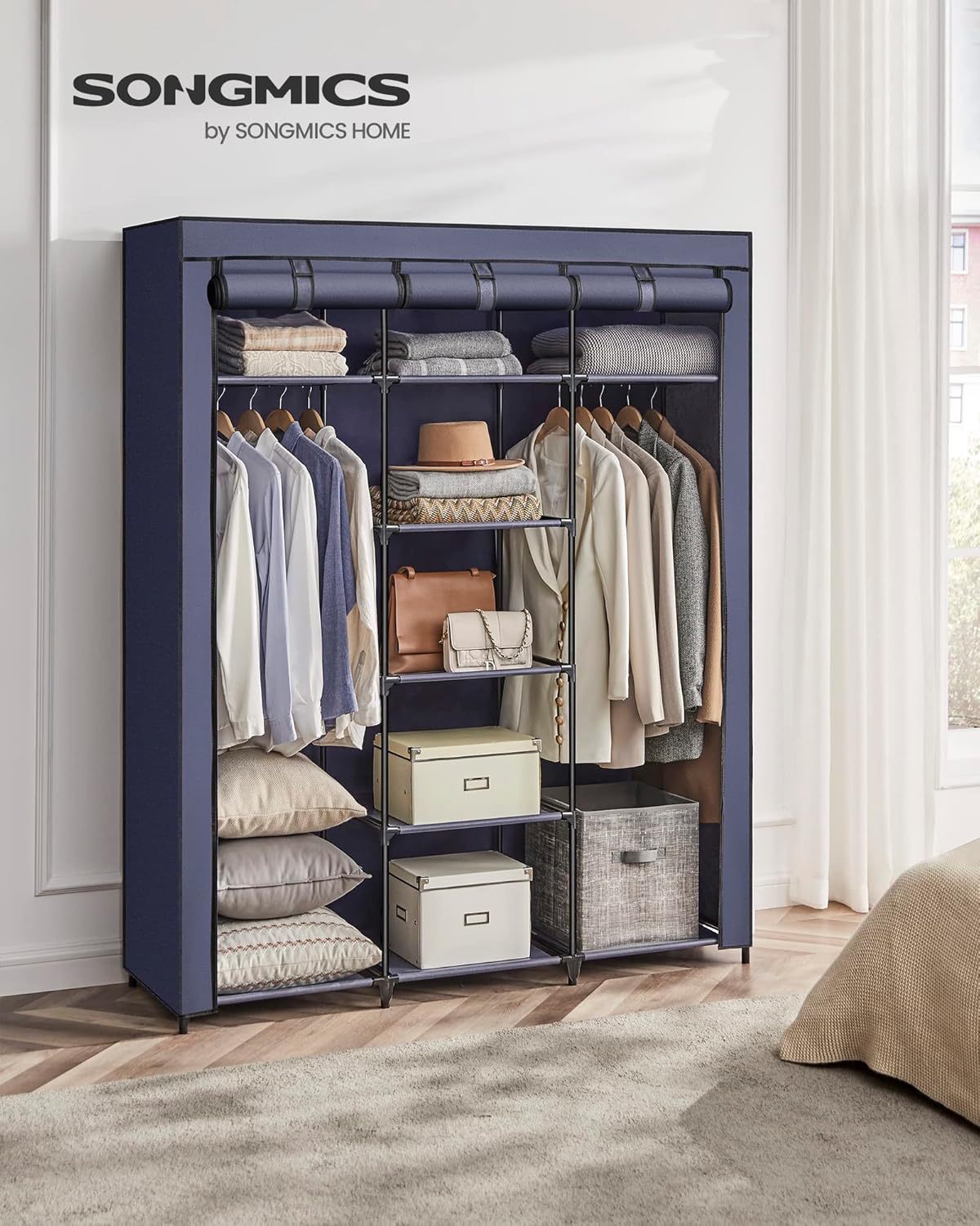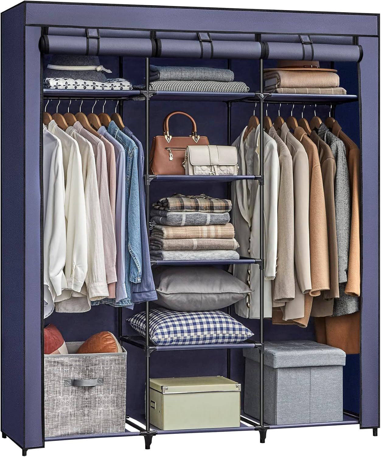 Hæng dit tøj på de 2 stænger i stofgarderoben i pæne rækker. Placer dine foldede klæder på hylderne. Når du skal vælge din påklædning til en stor dag, er alt hvad du har lige ved hånden