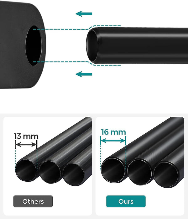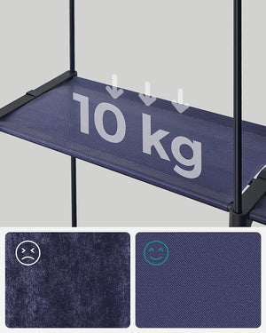 Vores garderobeskab er ikke bare rummeligt, det er også utroligt holdbart. Hver tøjskinne kan bære op til 30 kg takket være dens solide vægtykkelse på 0,4 mm. De fire metalrør med en diameter på 16 mm og de robuste dobbeltsidede plastikforbindelser sikrer, at hver stofhylde kan holde op til 10 kg. Du kan være sikker på, at dine yndlingskjoler og tøjstykker er i gode hænder.