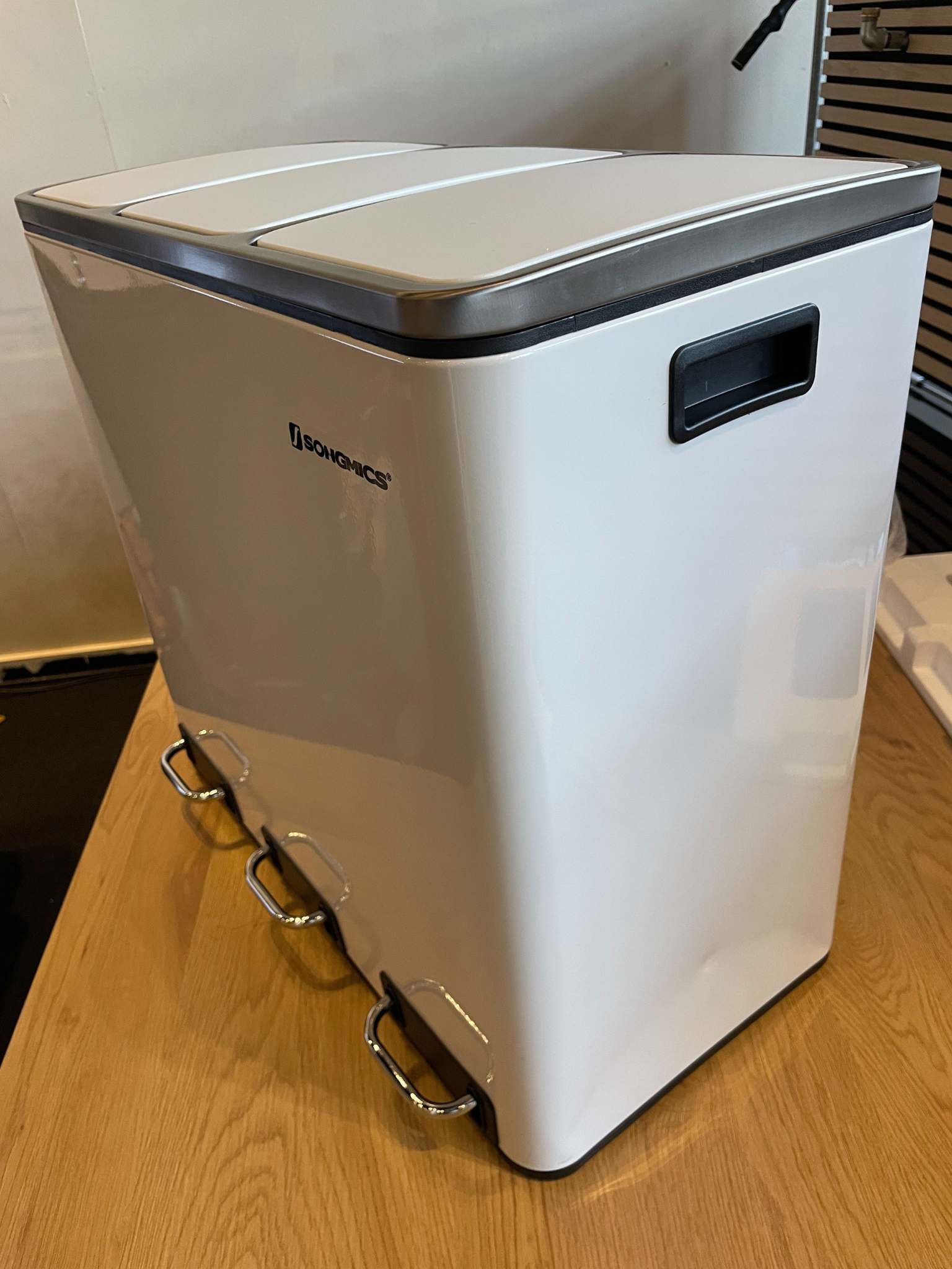 Dette smukke stykke er lavet med robust stål samt holdbar ABS plastik og PP plastik inderste beholderkonstruktion, hvilket sikrer, at den holder i ethvert miljø. Dens hvide farve giver den et simpelt rent udseende, hvilket gør, at den passer ubesværet ind i alle omgivelser. Med tre 18 liters aftagelige rum behøver du aldrig at bekymre dig om udtjente beholdere. Fodpedalen er med til at gøre livet nemt og rodfrit, så du nemt kan komme af med affaldet.
