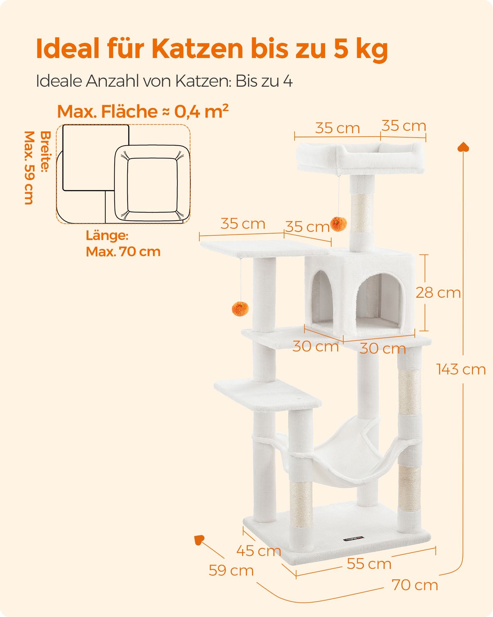 Dette kradsetræ er designet til at være enkelt at samle med universelle skruer og den medfølgende unbrakonøgle. Det er ikke kun let at sætte op, men også designet med flere niveauer og et klatretrin på siden, hvilket gør det nemt for både ældre katte og katte med mobilitetsproblemer at komme op og ned. Dette kradsetræ er perfekt til katte i alle aldre og størrelser.