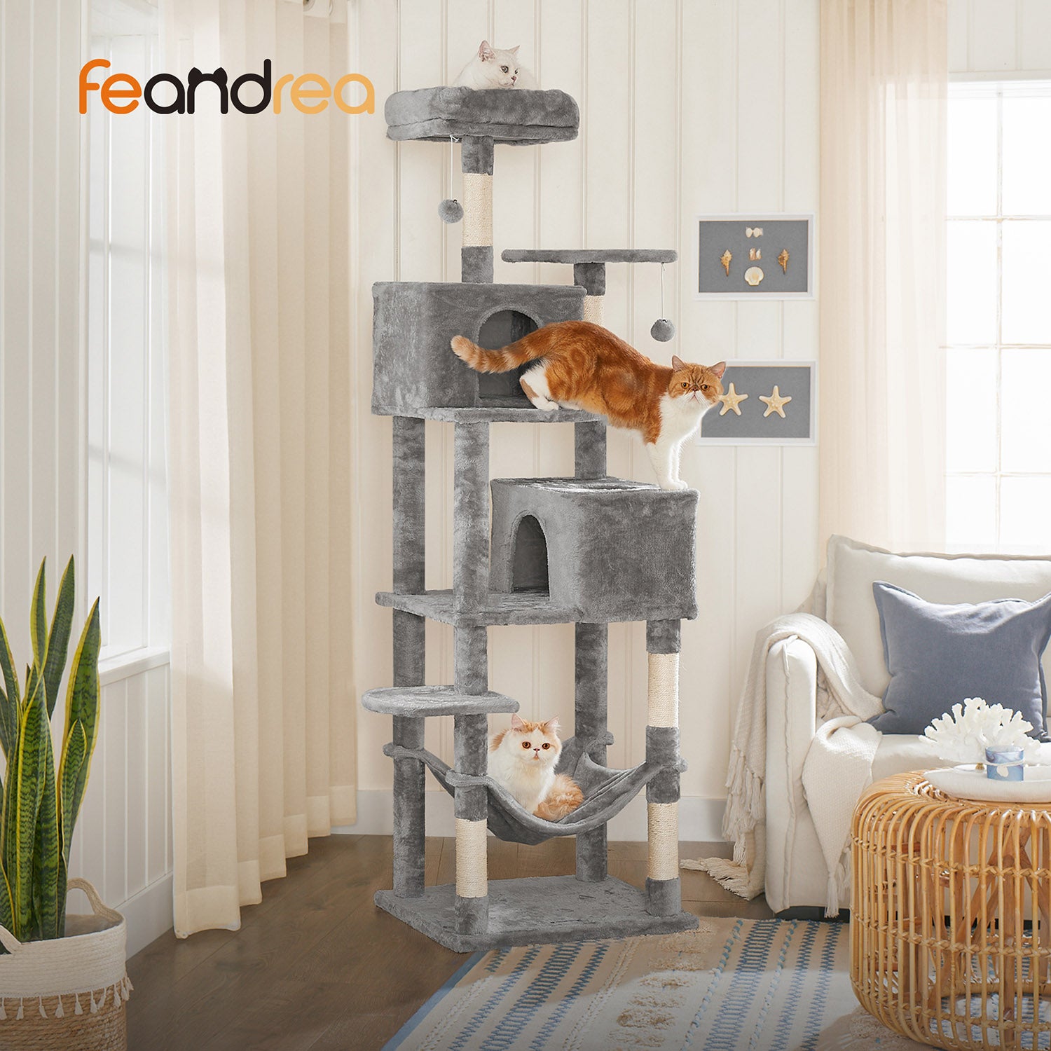 Træet er udstyret med en trappe for nem klatring, sisalindpakkede søjler til at hvæsse kløer, og flere afslappende områder som en blød hængekøje og to velpolstrede platforme med hævede kanter. Dette kradsetræ giver din kat alt, hvad den har brug for til både leg og afslapning.
