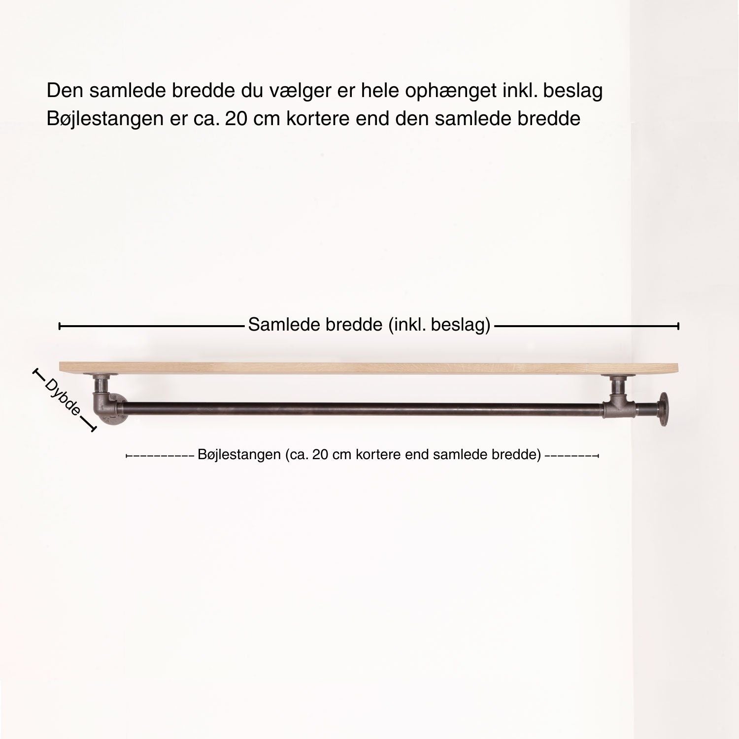 Bredde og dybde målet der er oplyst er målene på hylden som er det yderste punkt på ophænget. Selve bøjlestangen er 20 cm. kortere end hylden