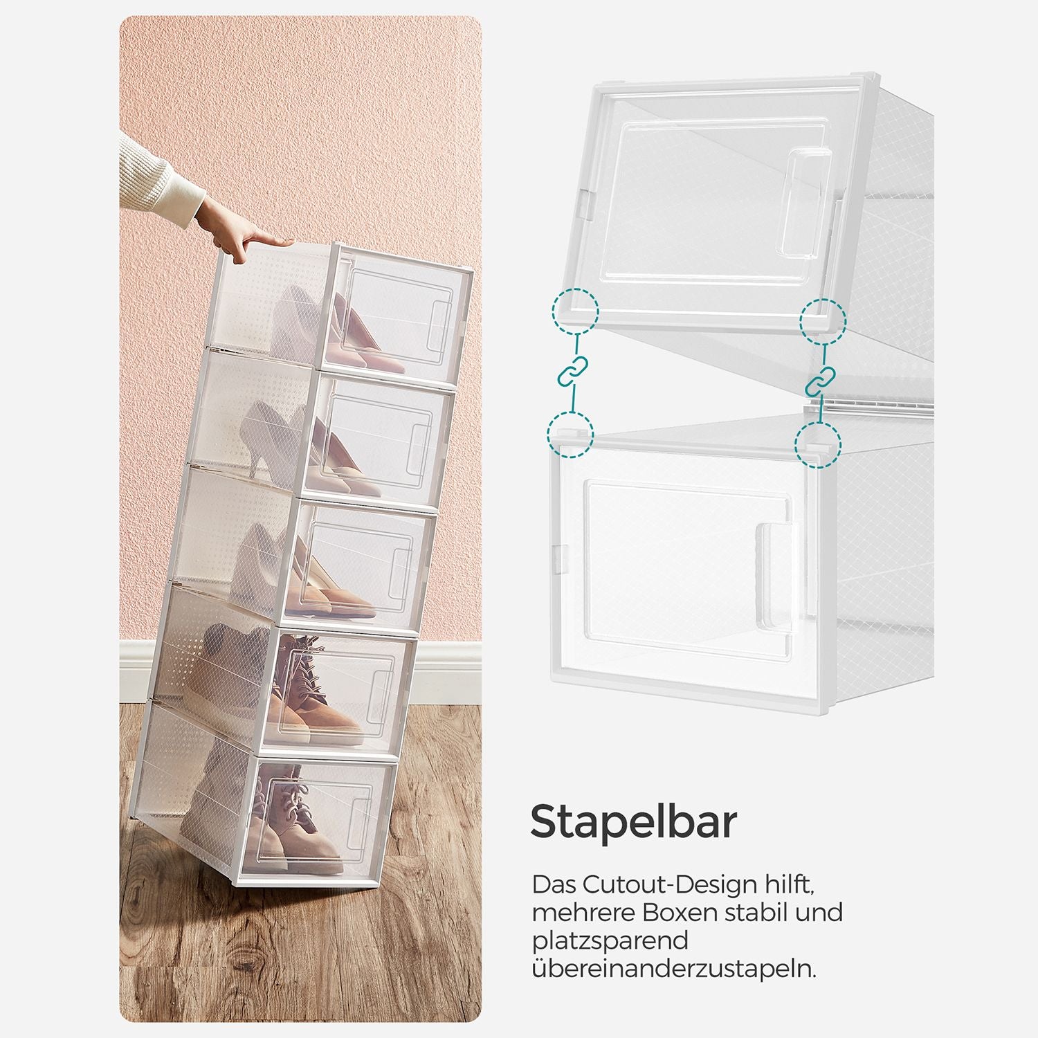 Hver skoæske måler 31 x 24,5 x 17,5 cm indvendigt og er ideel til sko op til størrelse 46. De stabelbare æsker kan nemt arrangeres i en høj stak eller adskilt for en mere fleksibel opbevaring. Ventilationshullerne sikrer, at dine sko altid forbliver friske. Med det foldbare design tager æskerne ikke meget plads, når de ikke er i brug.