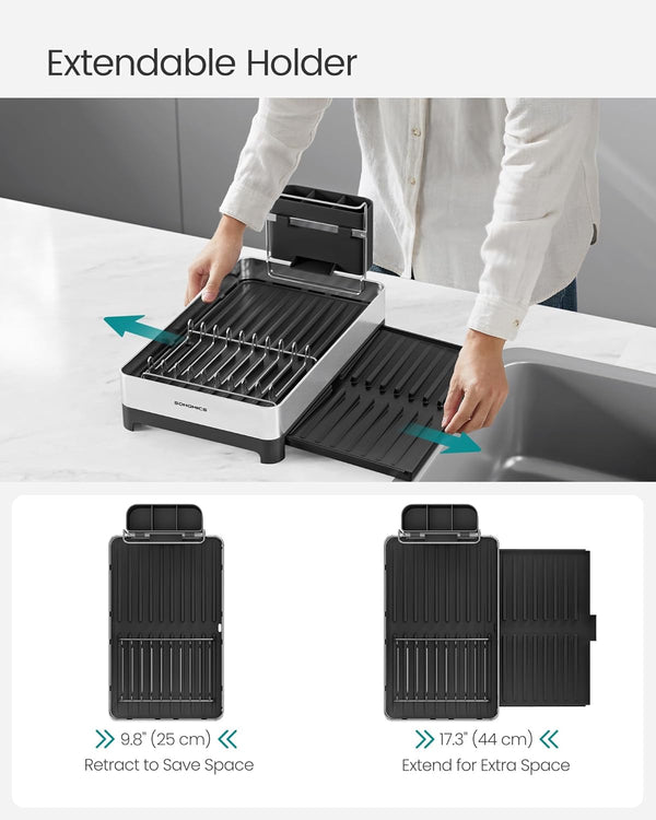 Det skrå afløb med spout leder vand direkte ned i vasken og holder bordpladen tør. Den udtrækkelige bakke giver ekstra plads og kan nemt trækkes ind for at spare plads, så stativet passer til alle køkkener.