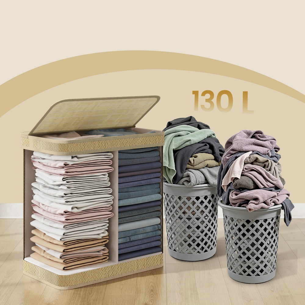 Med målene 58 x 39 x 61 cm og plads til 130 liter kan denne vasketøjskurv nemt klare en uges vasketøj for 2 personer. De to sektioner gør det let at sortere tøjet efter farver, fx mørkt og lyst.