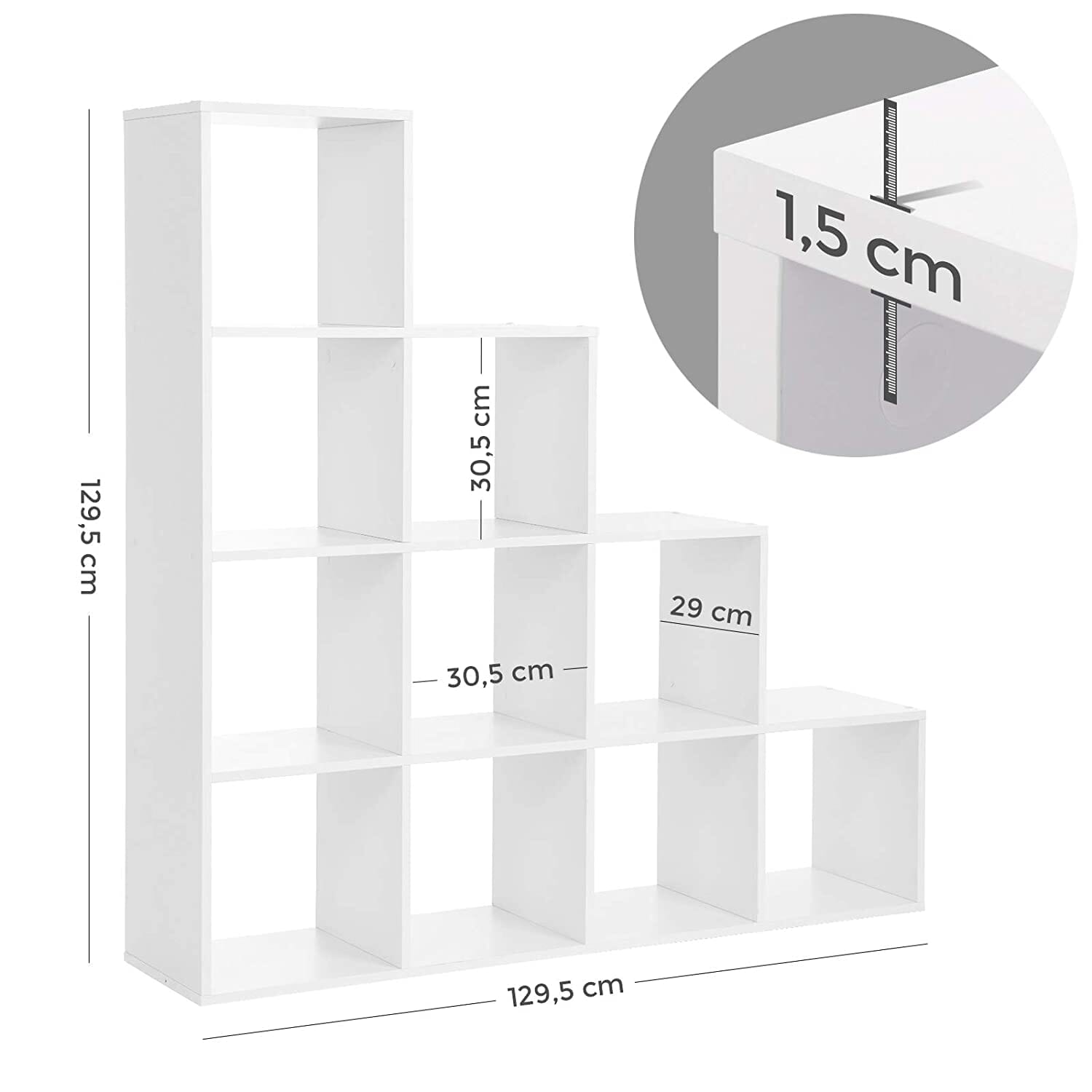 Pladsbesparende og alligevel rummelig: Med Størrelse på 129,5 x 129,5 x 29 cm har denne reol masser af plads til alle de små kroge og hjørner! 10 hylder gør det nemt at opbevare dine ting og holde dem organiseret.