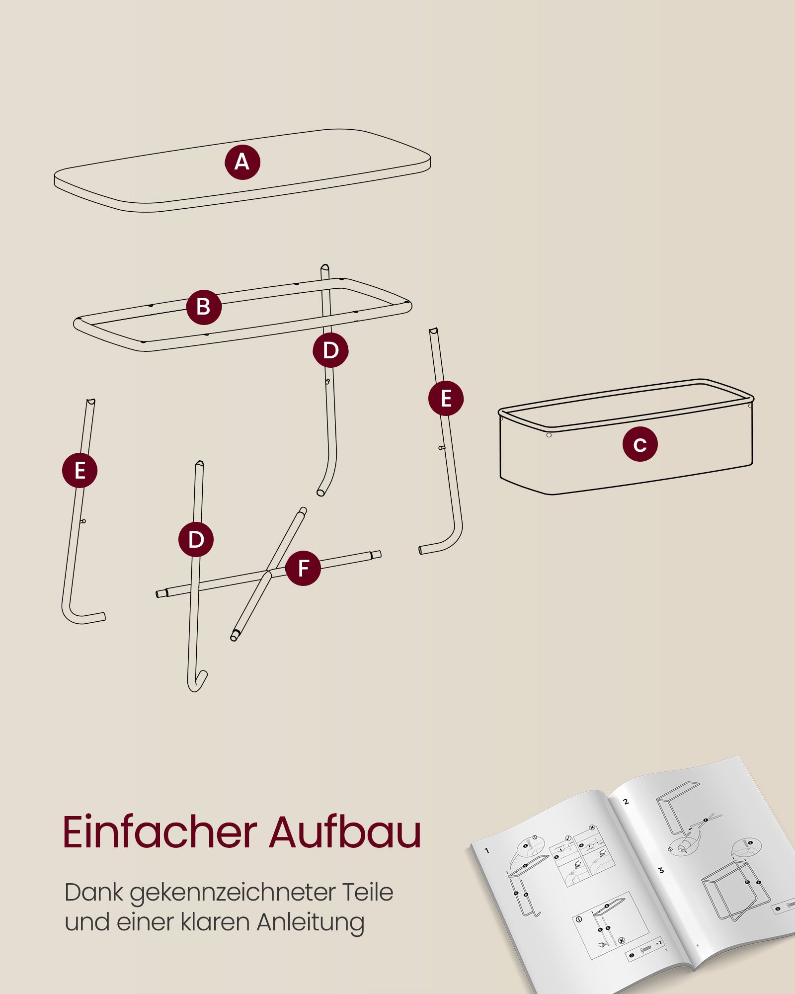 Dette senge- og sidebord kombinerer både stabilitet og æstetik. Bordpladen i spånplade er solidt fastgjort til rammen, hvilket sikrer, at bordet ikke vakler. De U-formede stålben giver en solid støtte, og de justerbare fødder sørger for, at bordet står stabilt uden at ridse gulvet. Den moderne, matte hvide finish kombineret med den camelbrune stofkurv giver bordet et elegant og tidløst udseende, der let matcher forskellige møbelstilarter.