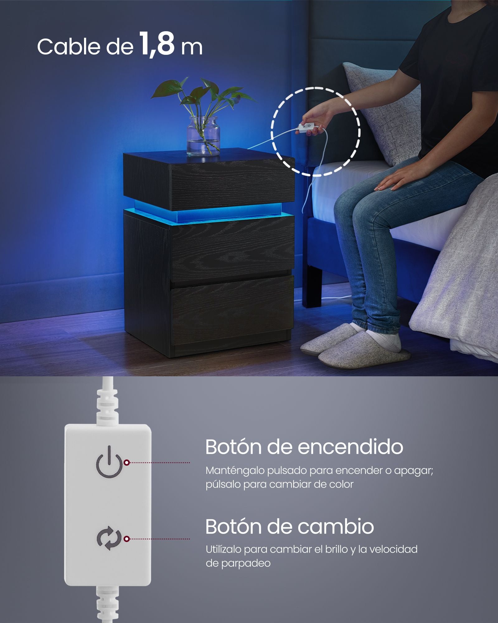 25 farver, 6 lysstyrker, 3 blinkende tilstande og 6 blinkfrekvenser - juster LED-belysningen på natbordet med den medfølgende fjernbetjening for at skabe forskellige stemninger.