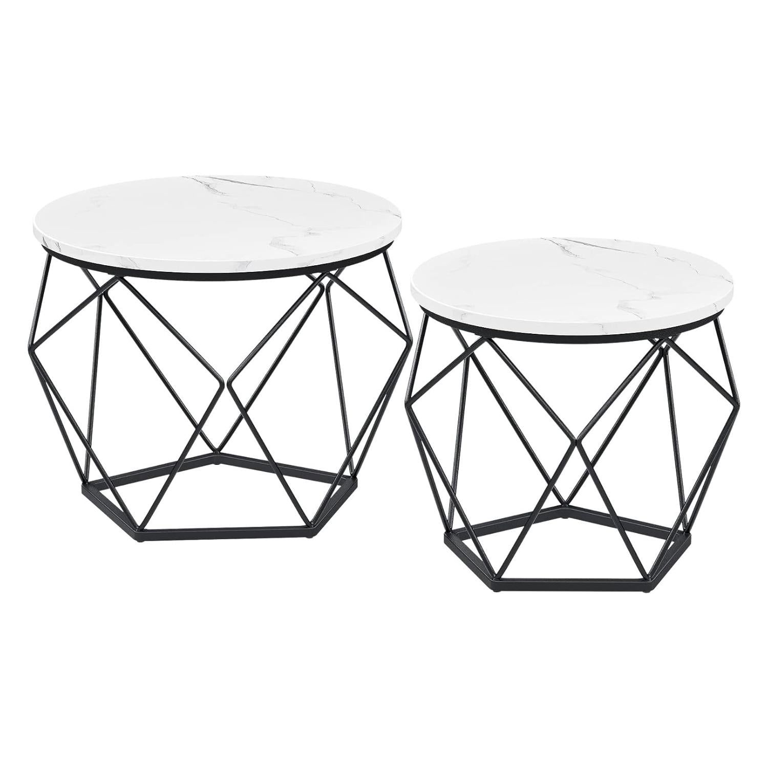 Disse moderne sofabord til din stue bringer et specielt touch til dit rum med runde hvide toppe og geometriske sorte stålbaser. Deres attraktive udseende vil imponere dine gæster.