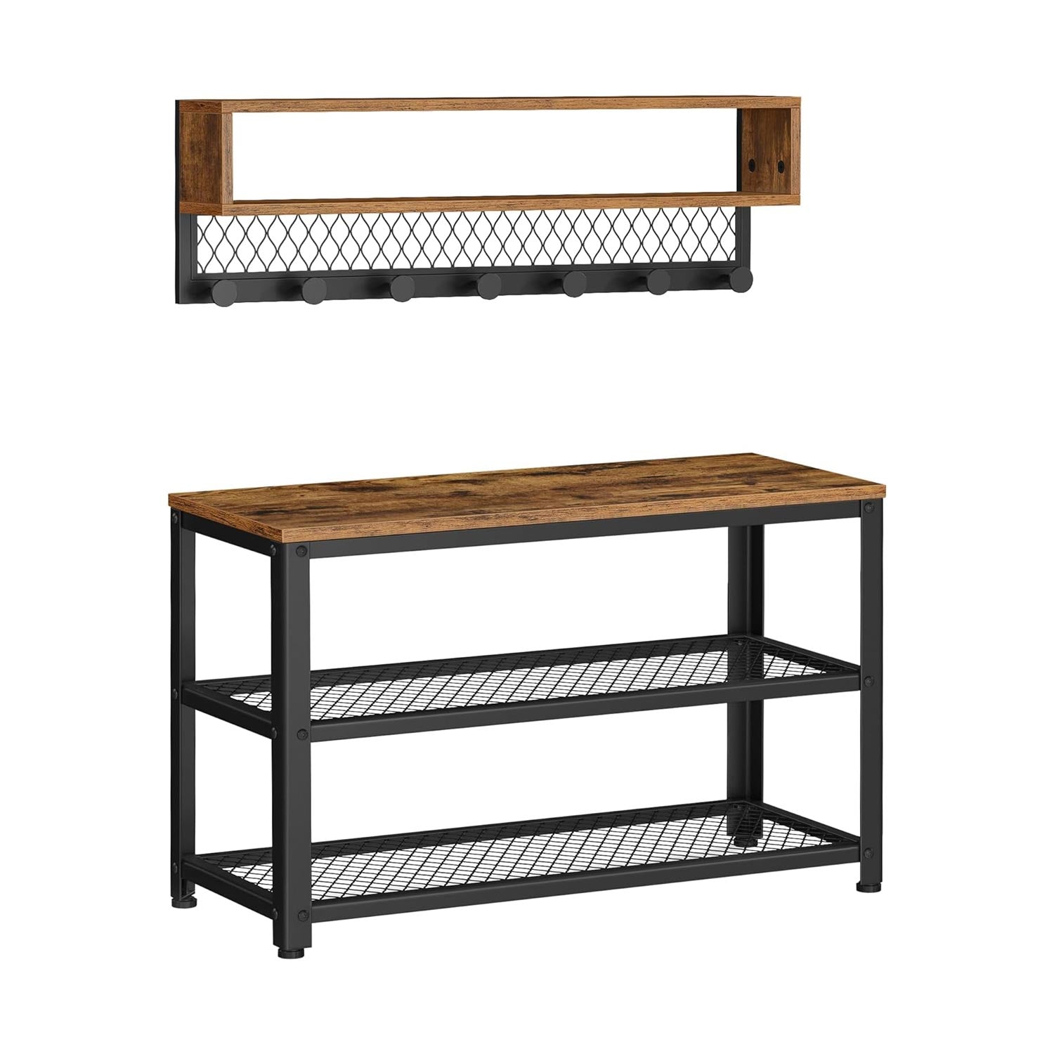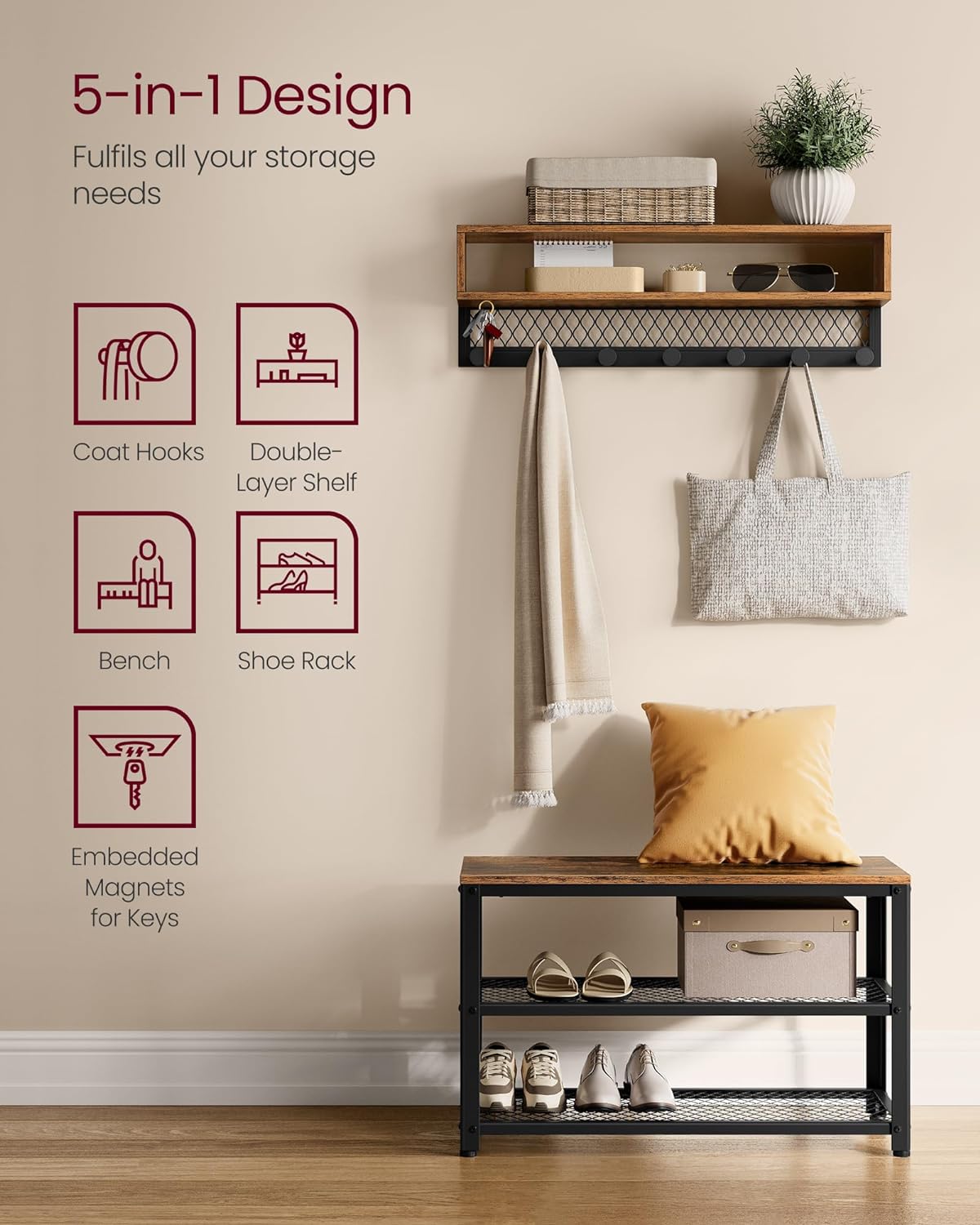 Denne entrébænk er mere end bare et sted at sidde. Med en dobbeltlags hylde til dekorationer, 7 knager til tasker og tøj, 3 indbyggede magneter til nøgler og en 2-etagers skohylde, dækker dette møbel alle dine behov. Det er det ultimative multifunktionelle møbel til din gang, som gør det nemt at holde styr på alle dine ting.