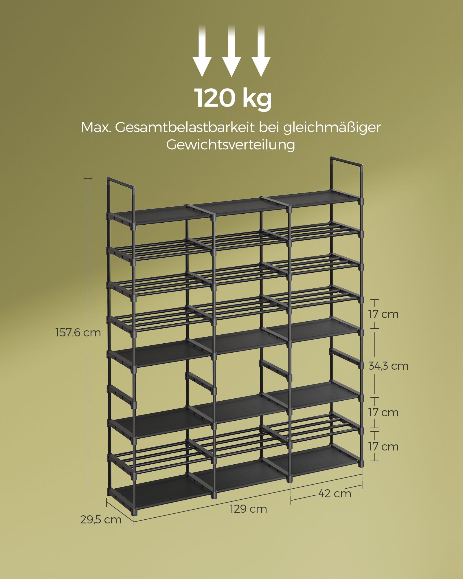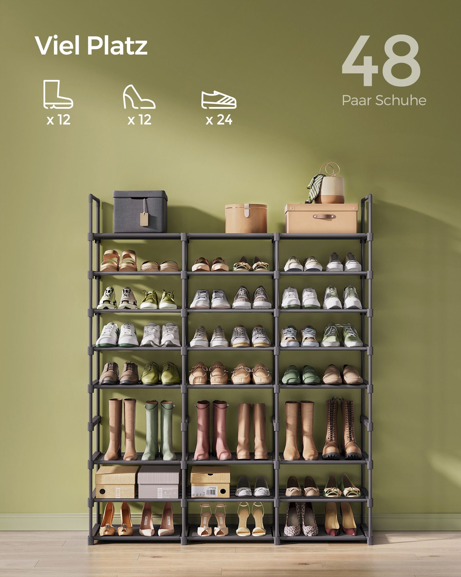 Med plads til op til 48 par sko tilbyder denne skoreol en imponerende opbevaringskapacitet. De 8 hylder giver dig rigelig plads til at organisere dine sko, men reolen er ikke kun begrænset til fodtøj. Den alsidige opbevaringshylde kan også bruges til opbevaring af bokse, tasker og andre genstande, hvilket gør den til en alsidig løsning i dit hjem. Uanset om du har brug for ekstra opbevaringsplads i gangen, soveværelset eller på kontoret, vil denne skoreol imødekomme dine behov.
