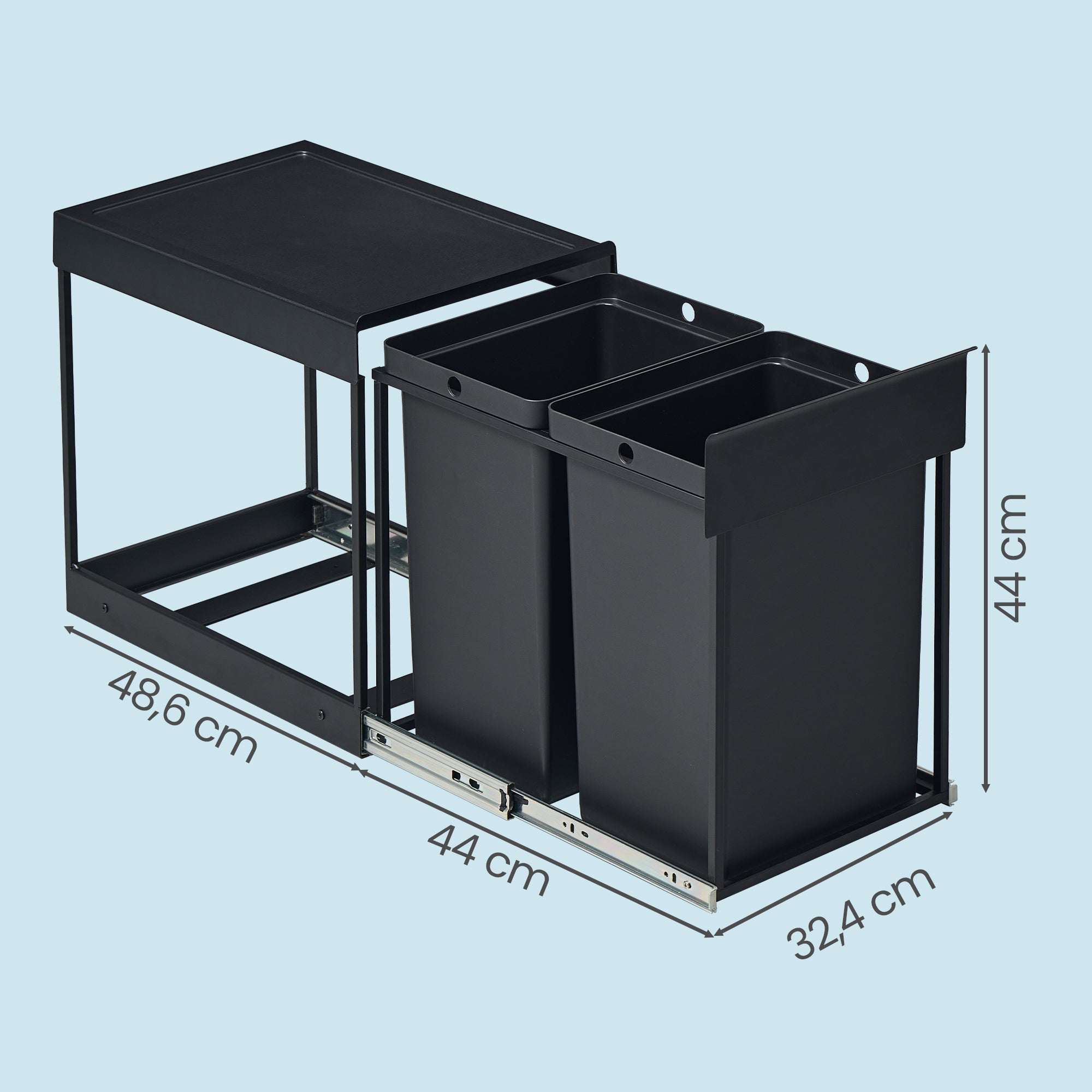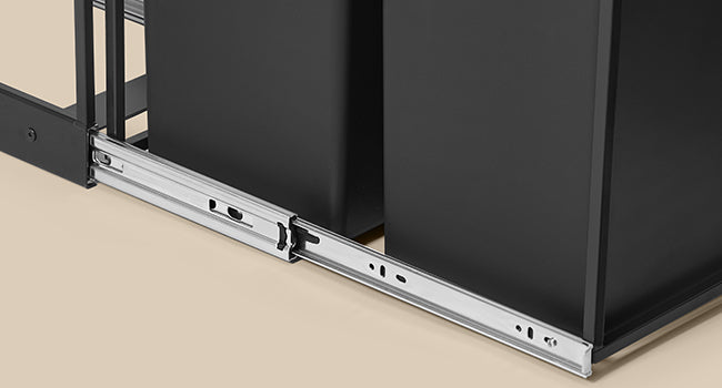 Den solide stålramme og udtrækket på metalskinner gør, at spanden kører stabilt og glat – også ved daglig brug.
