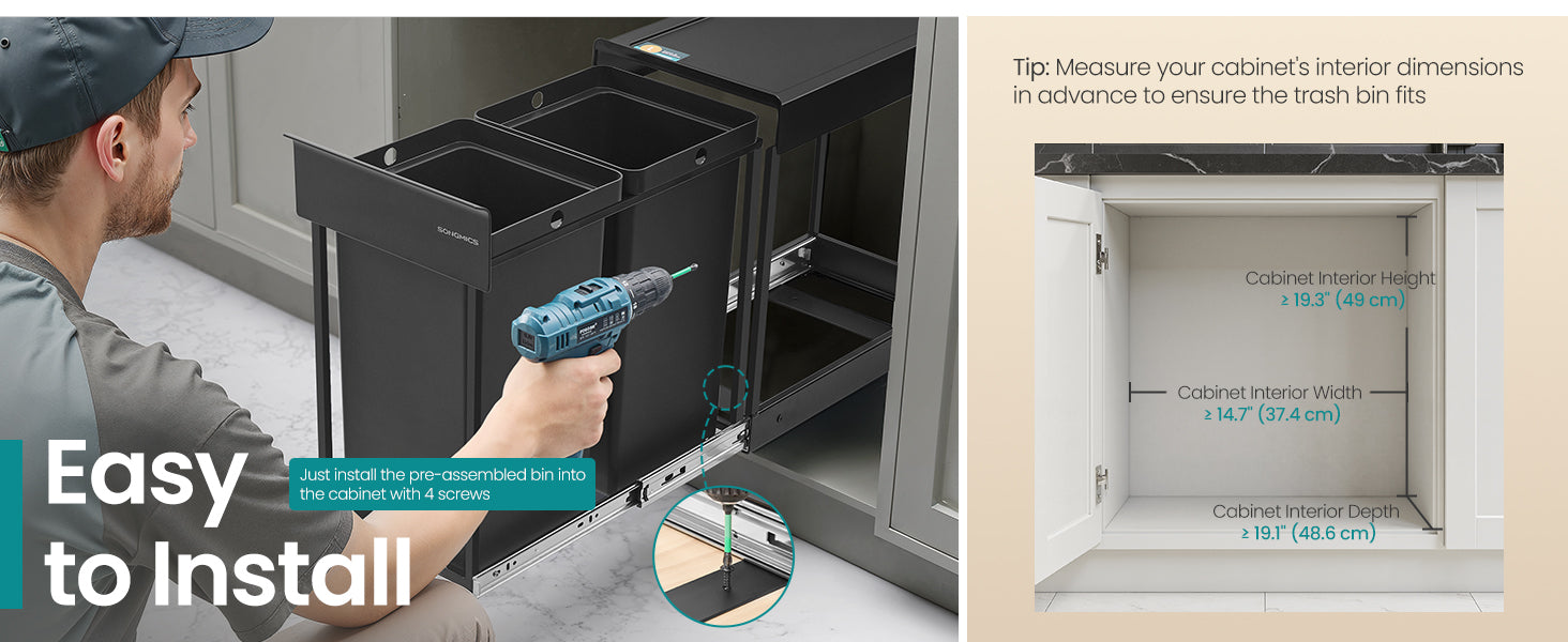 Skraldespanden leveres færdigsamlet og monteres direkte i bunden af skabet med få skruer.