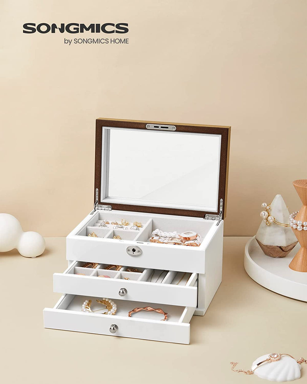 Ringe fortjener en særlig opmærksomhed. De små skatte kan nemt få ridser, hvis de ligger op ad hinanden. Derfor er separat organisering, som runde puder i et skrin, en fantastisk måde at holde dine ringe sikre og skinnende rene på. Et smykkeskrin med mange rum giver ikke kun dine ringe deres egne små troner, men hjælper også med at bevare ædelstenenes glans og metallets finish. Det er en lille investering, der betaler sig i lang tid, når dine ringe forbliver lige så funklende som den dag, de blev købt.