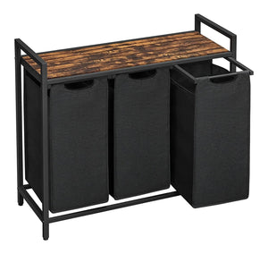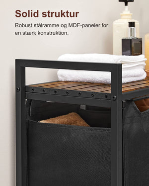 3 poser, 1 hylde - Et rummeligt design til sortering og opbevaring af dit vasketøj! Tre stofposer giver rigelig plads til dit tøj, mens hylden er ideel til vaskemidler og blødgøringsmidler. Hold alle dine opbevaringsbehov organiseret med denne alsidige vasketøjskurv.