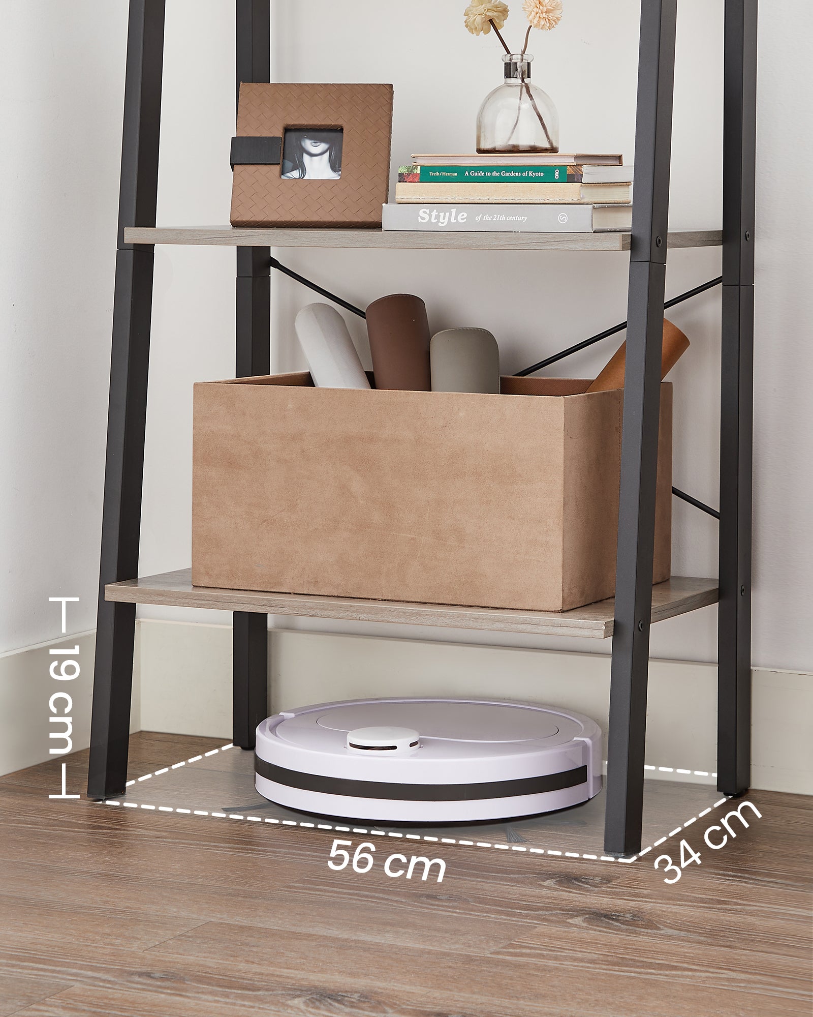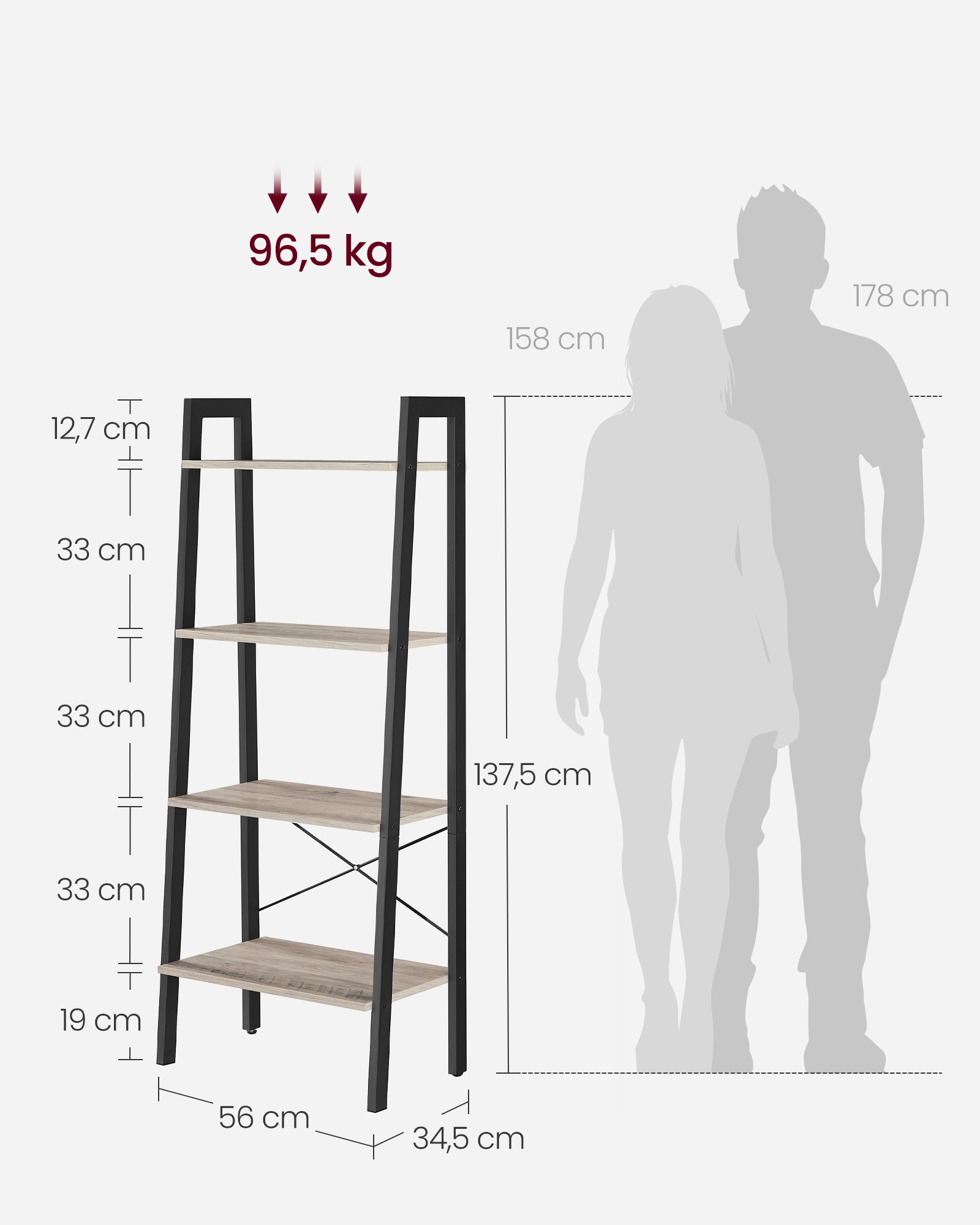 Med målene 34 x 56 x 137,5 cm får du masser af opbevaringsplads uden at stigereolen fylder meget. Afstanden mellem hylderne er 33 cm, så også højere genstande passer nemt, og 19 cm frihøjde gør det let at gøre rent under.