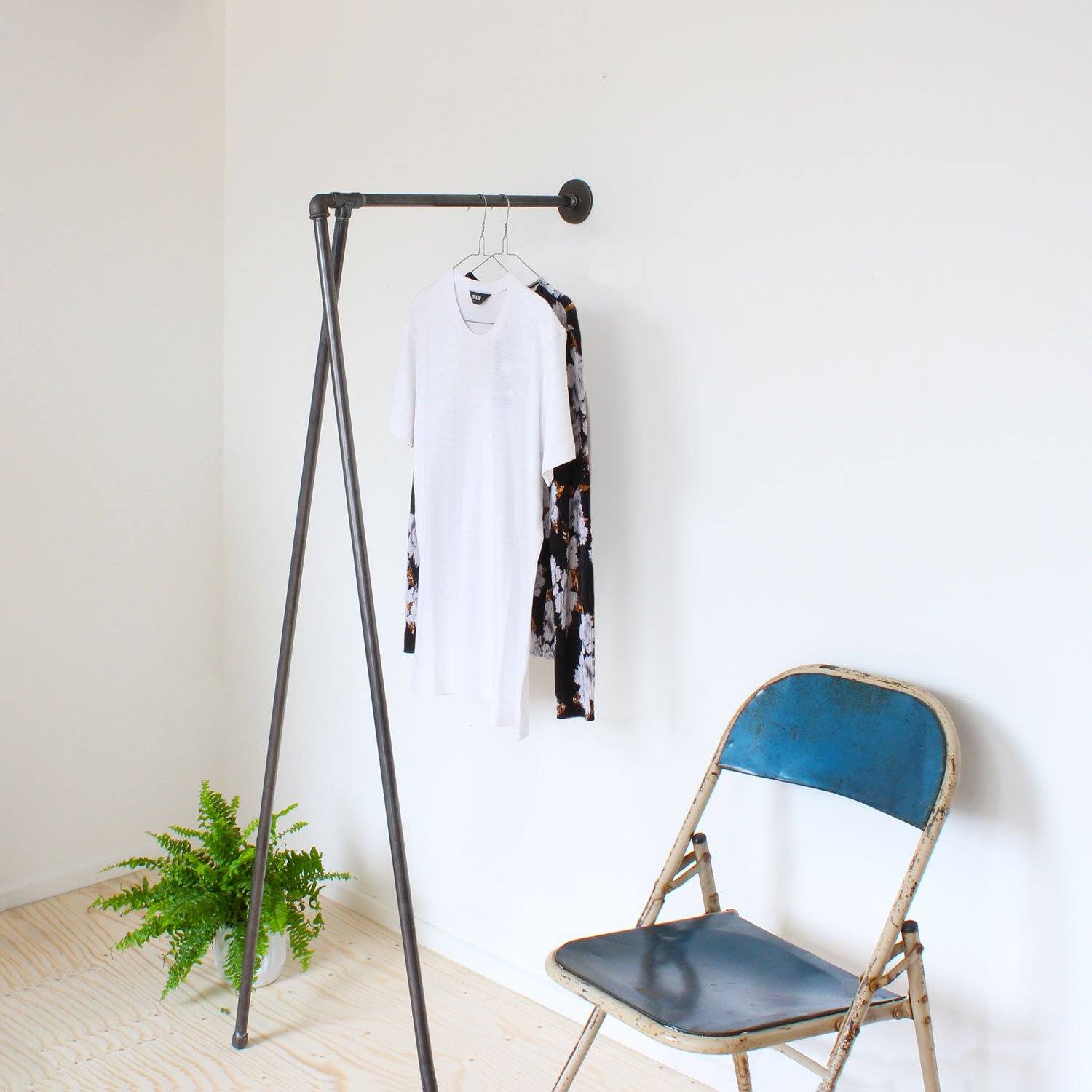 Rustikt tøjstativ af rå sorte vandrør som sættes fast i væggen og udnytter gulvpladsen. Plads til hele garderoben med en høj bøjlestang som kan bruges til kjoler. Går rigtig godt i en rustik indretning Rustikt tøjstativ af rå sorte vandrør som sættes fast i væggen og udnytter gulvpladsen. Plads til hele garderoben med en høj bøjlestang som kan bruges til kjoler. Går rigtig godt i en rustik indretning