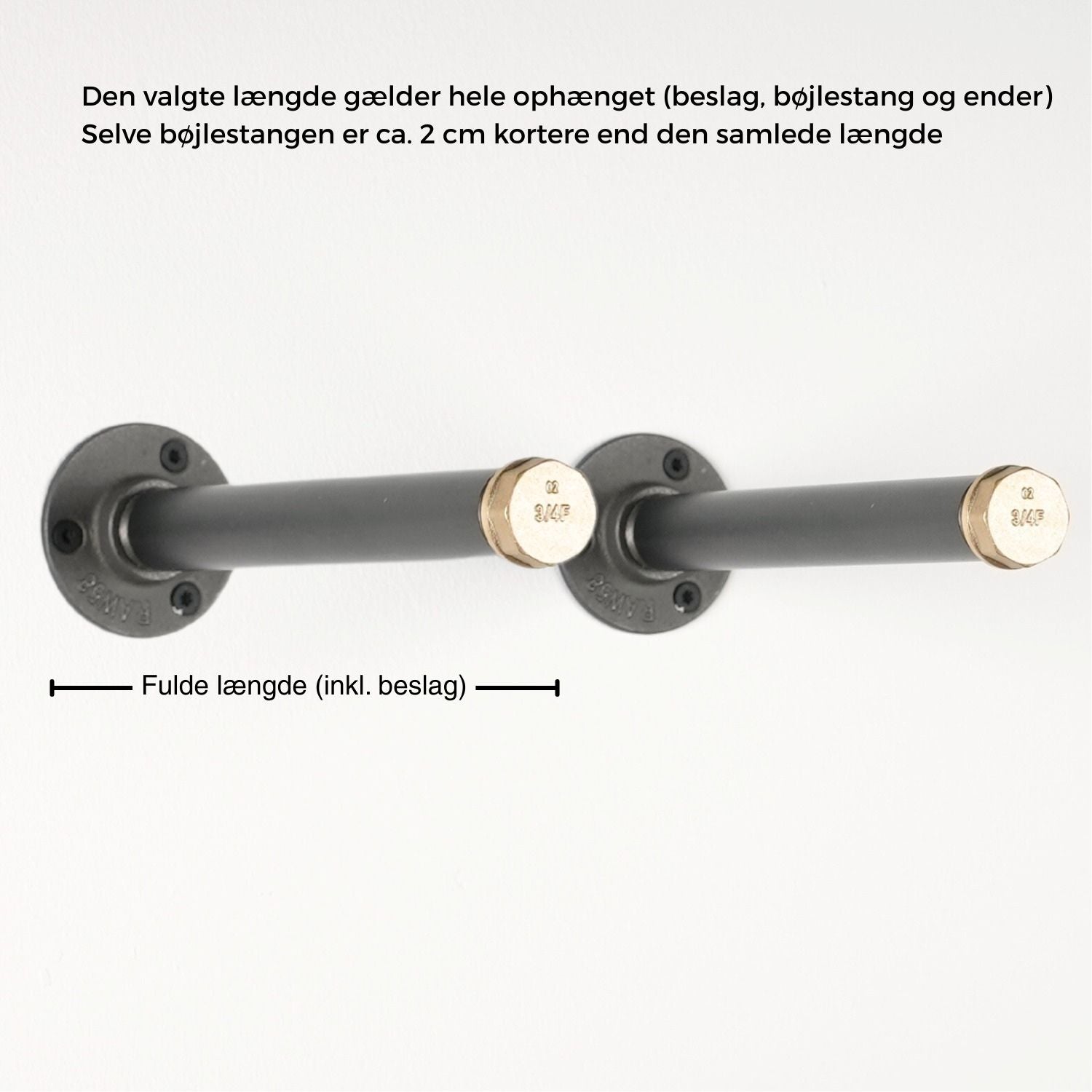 | Bemærk: Den samlede længde du vælger er hele ophænget inkl. enden og beslag. Bøjlestangen er ca. 2 cm kortere end den samlede længde. |