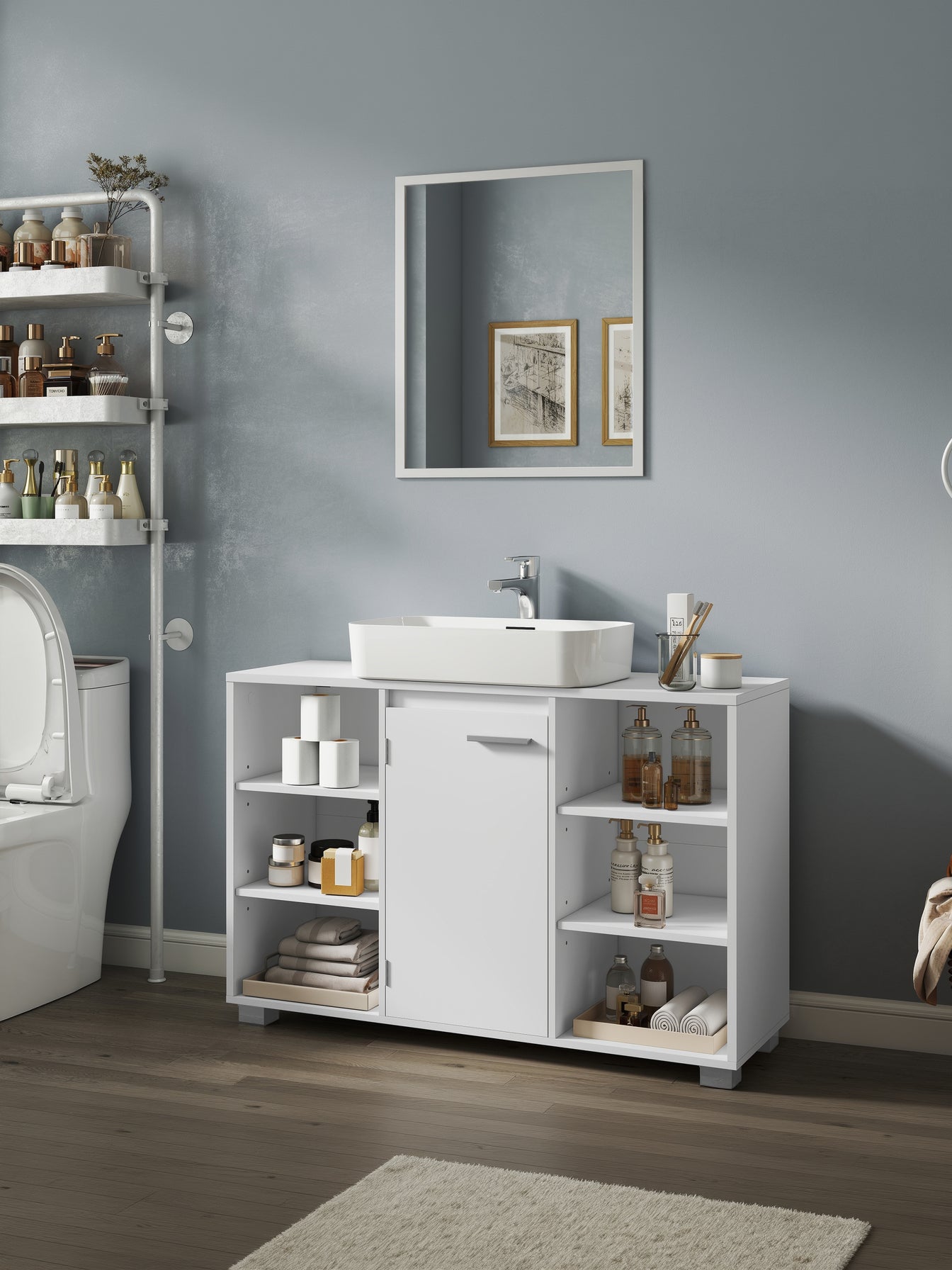 Det symmetriske design, de rene linjer og den flotte grå-hvide farvekombination giver underskabet et moderne udtryk, der passer perfekt ind på badeværelset.