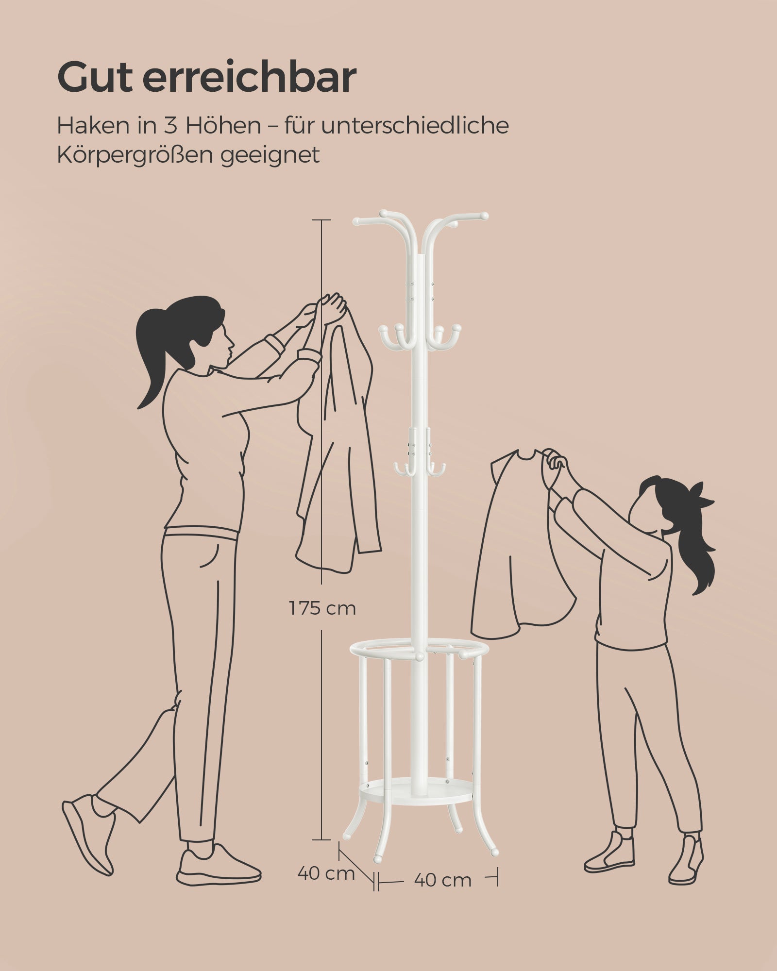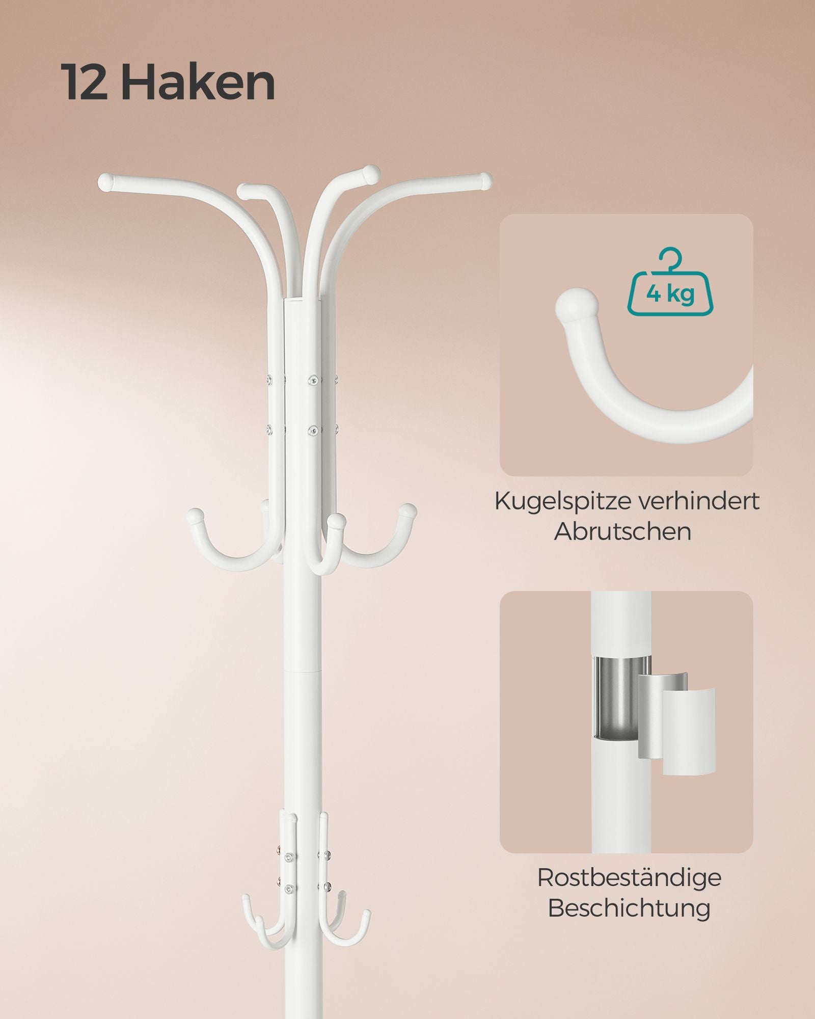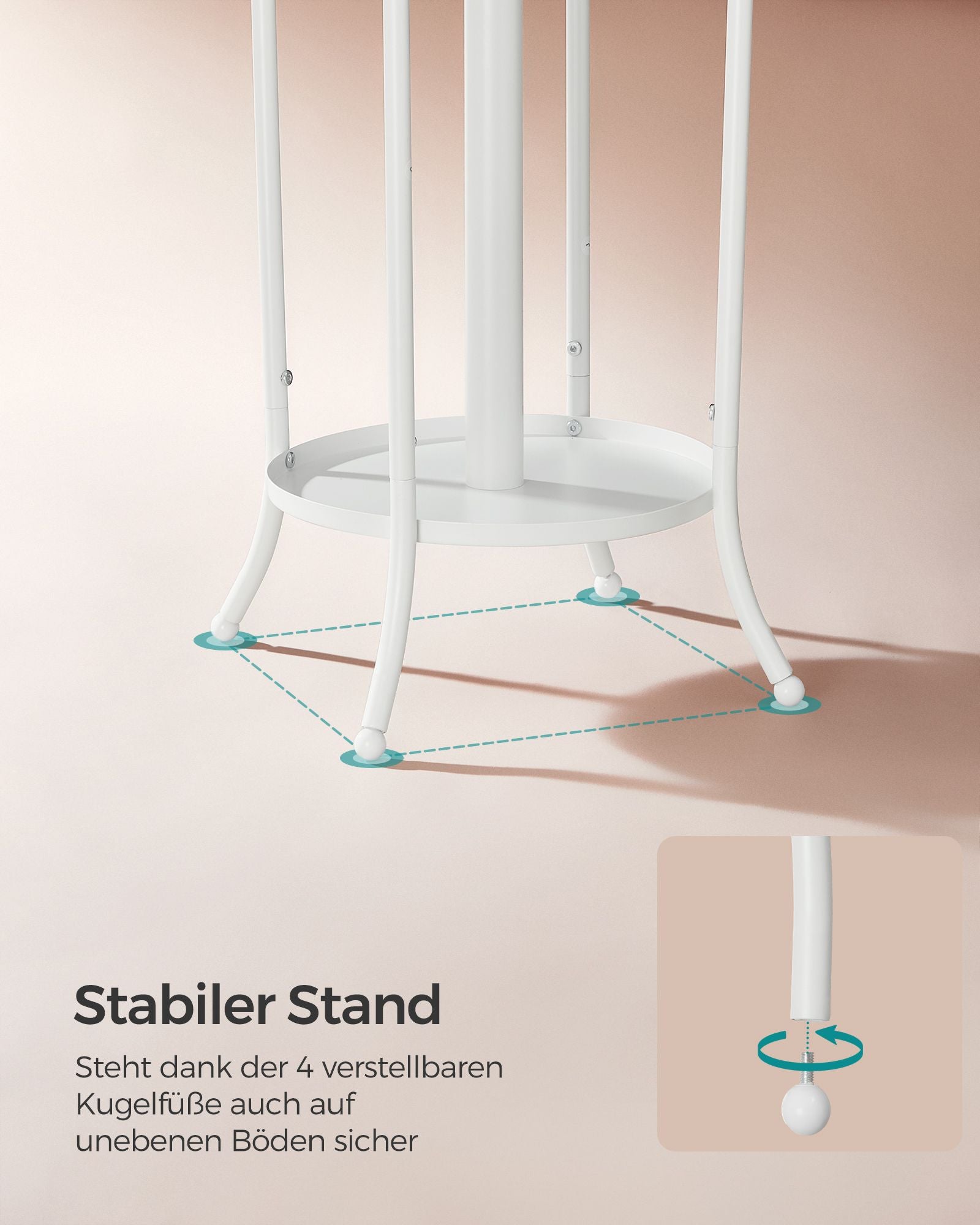 Dine frakker og jakker er i trygge hænder med denne stumtjener. De 12 kugle-tippede kroge forhindrer tøj i at glide af, samtidig med at de beskytter stoffet mod skader. De fire kugleformede justerbare fødder sikrer, at stumtjeneren står stabilt, selv på ujævne gulve. Ingen vaklen, bare pålidelig opbevaring af dit overtøj og tilbehør.