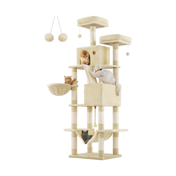 Med 2 vel polstrede platforme, 2 hyggelige huler, 1 blød kurv, 2 plysbold og 1 hængekøje, vil enhver kat finde sit foretrukne sted på dette fleretagers og komfortable kradsetræ - perfekt til hjem med flere katte.