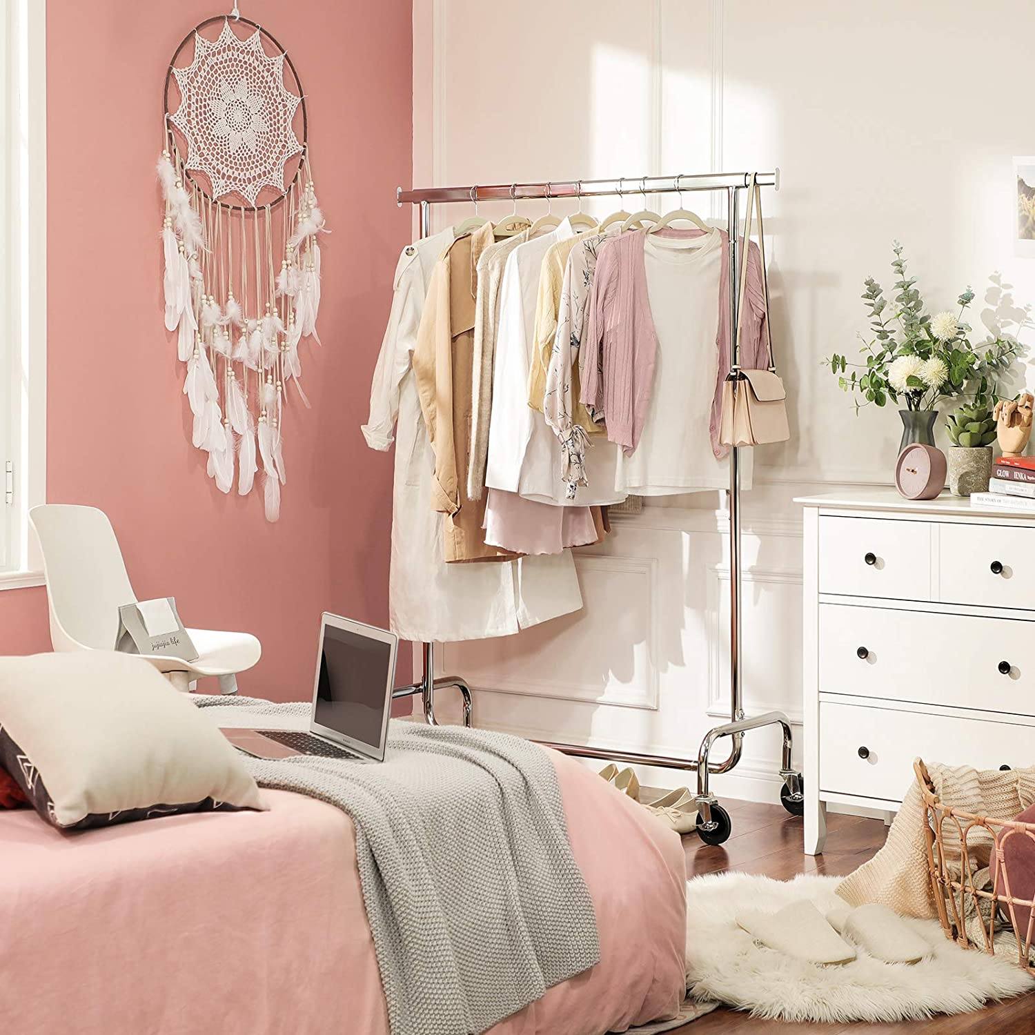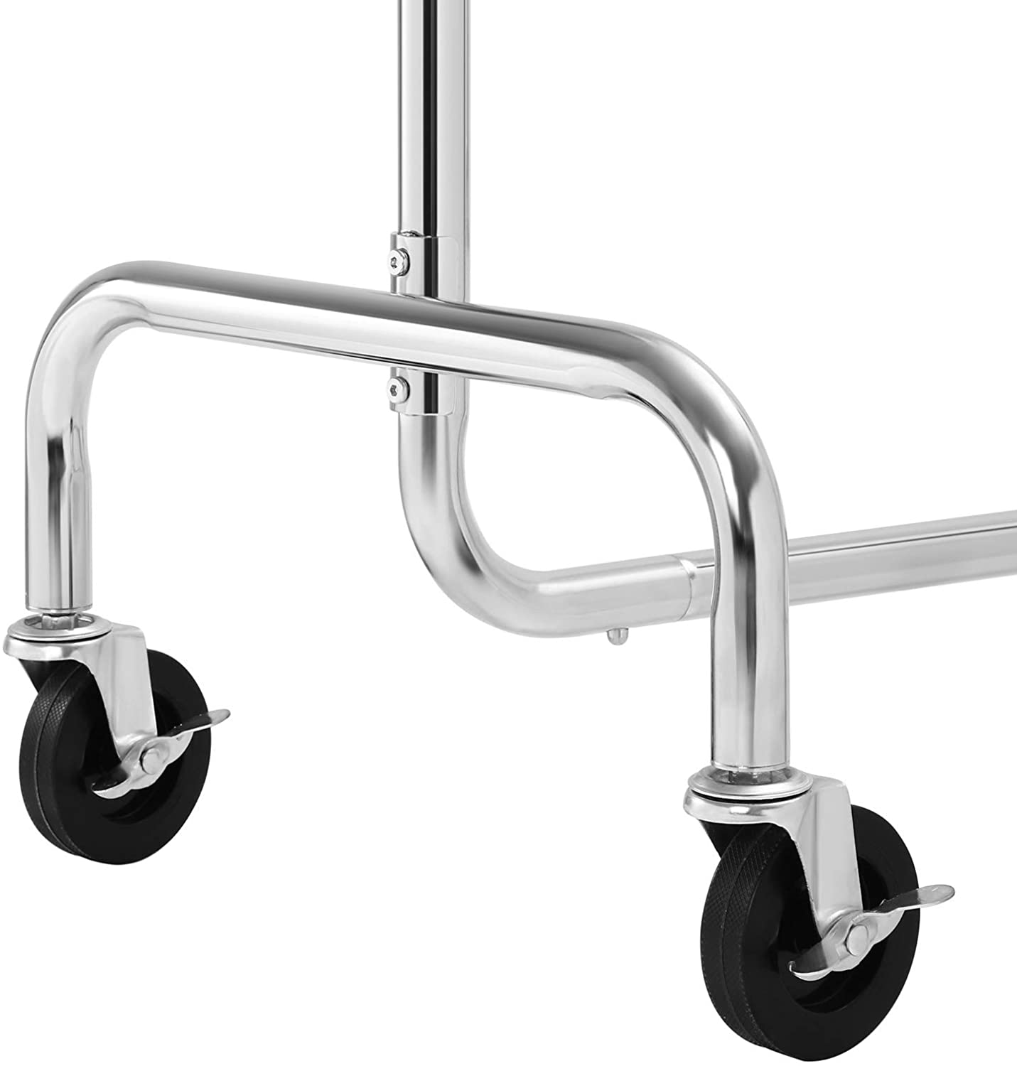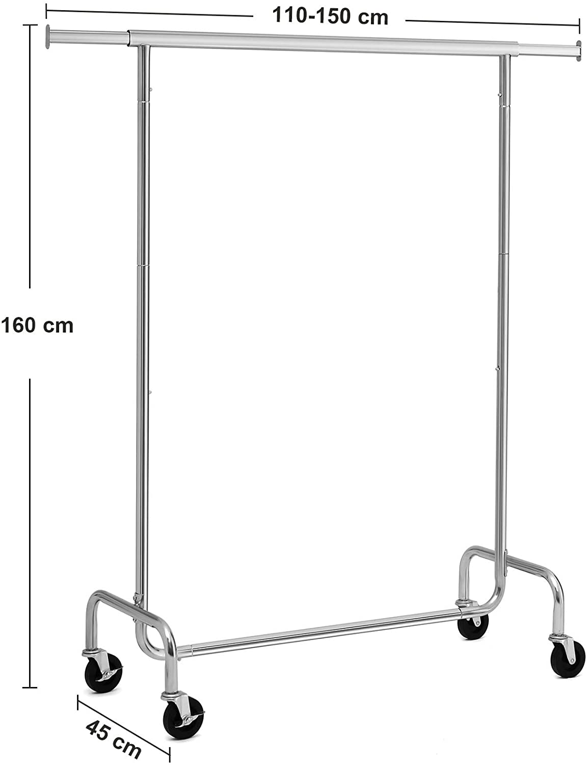 Er der for meget tøj i dit skab, som bare aldrig synes at passe? Ikke længere! Dette alsidige tøjstativ kan udvides fra 110 cm til 150 cm i bredden og kan holde op til 130 kg. Det er plads nok til ethvert klædeskab. Og det bedste er? Den leveres på hjul med stop, så du nemt kan flytte den rundt, hvis du vælger at flytte den i dit hjem. Du behøver ikke længere løfte de tunge skuffer for at finde et outfit - alt er altid godt organiseret på ét sted!
