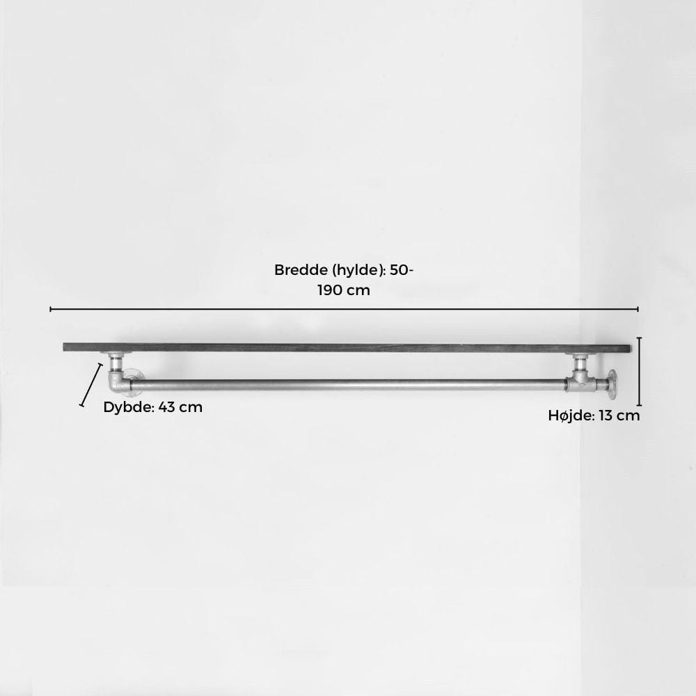 Lad os tage et eksempel: Vælger du bredden 120 cm. Så er hylden 120 cm. lang og selve bøjlestangen er 100 cm.