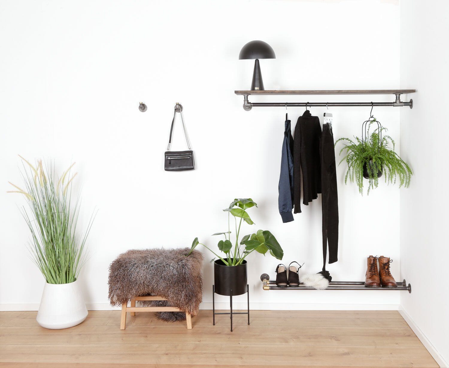 Perfekt tilpasset enhver indretning - Liam Bøjlestangen i vandrør med hylde er ikke kun en praktisk opbevaringsløsning; den er også alsidig og kan tilpasses enhver indretningsstil. Uanset om din stil er nordisk minimalisme eller moderne erhvervslokaler, vil Liam bøjlestangen integrere smukt med din indretning og tilføje en touch af elegance til ethvert rum.