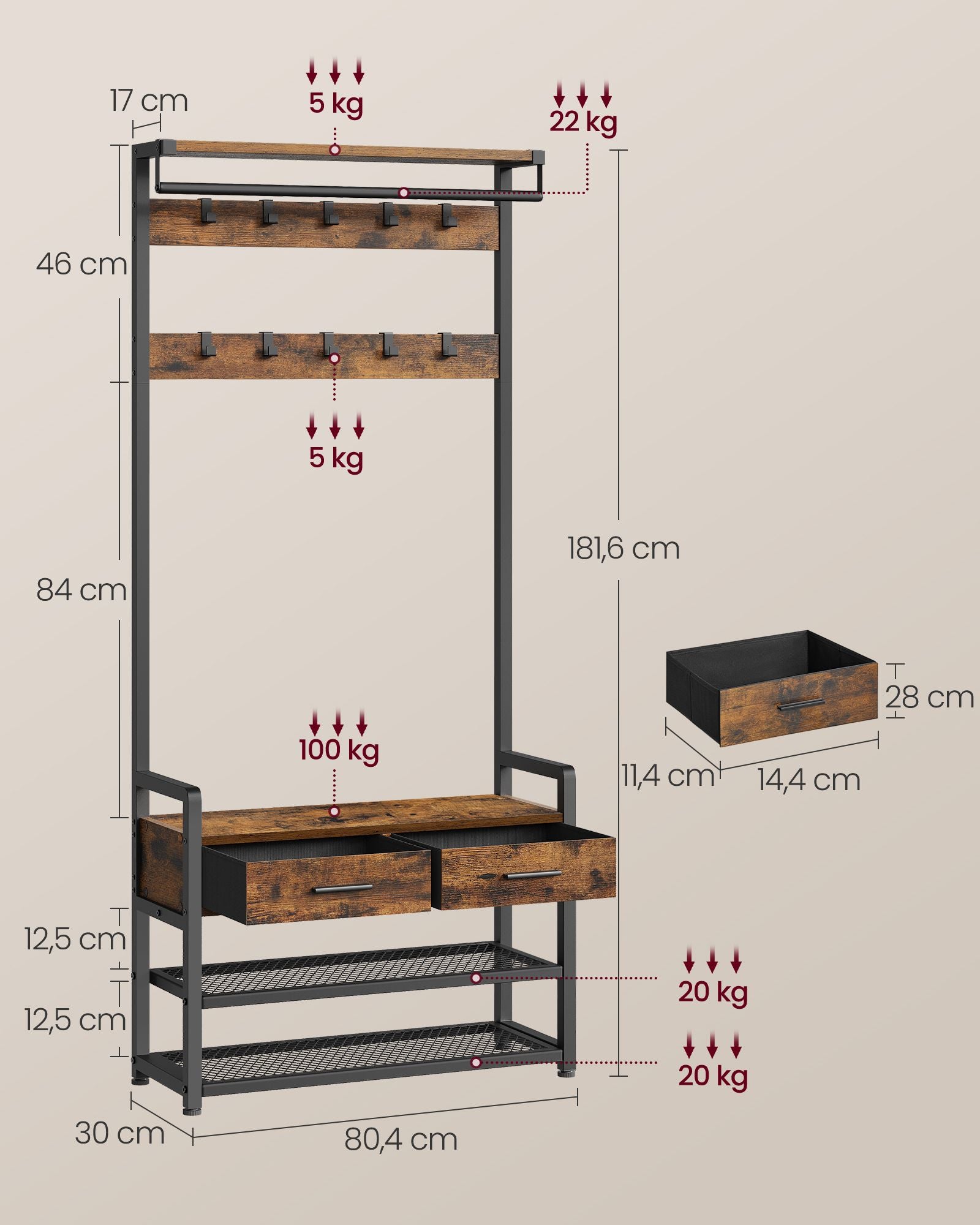 Forvandl din entré til en organiseret og funktionel plads med denne alsidige 6-i-1 løsning. Med 10 knager, 2 skuffer, en bøjlestang, en bænk, en skoreol og opbevaringshylder, har du alt, hvad du behøver for at holde styr på overtøj, sko og tilbehør. Uanset om du kommer hjem med en fuld indkøbspose eller skal hurtigt ud ad døren, gør dette møbel det nemt at holde styr på det hele.