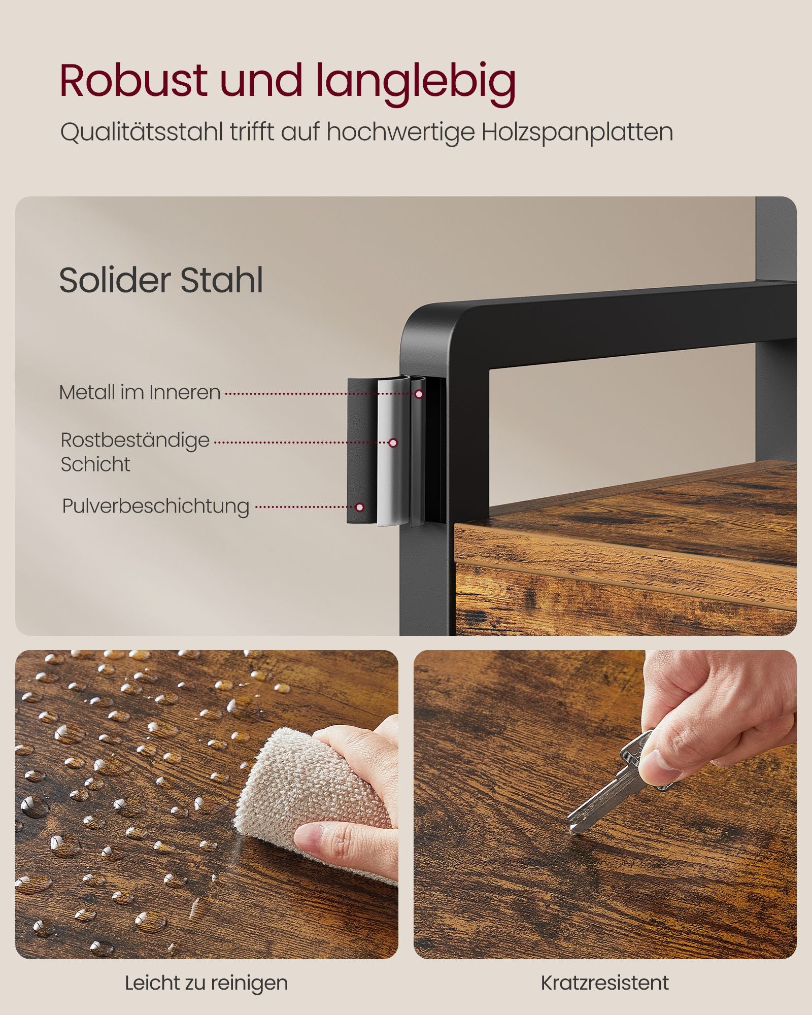 Denne entrémøbel er skabt til at være lige så robust som den er praktisk. Bygget af kvalitets spånplader og stærkt stål, kan du stole på, at den vil holde til daglig brug. Med justerbare fødder og et anti-tip kit inkluderet, står dette møbel solidt og sikkert, uanset om du bruger det som en helhed eller deler det op i en vægmonteret knagerække og en skobænk.