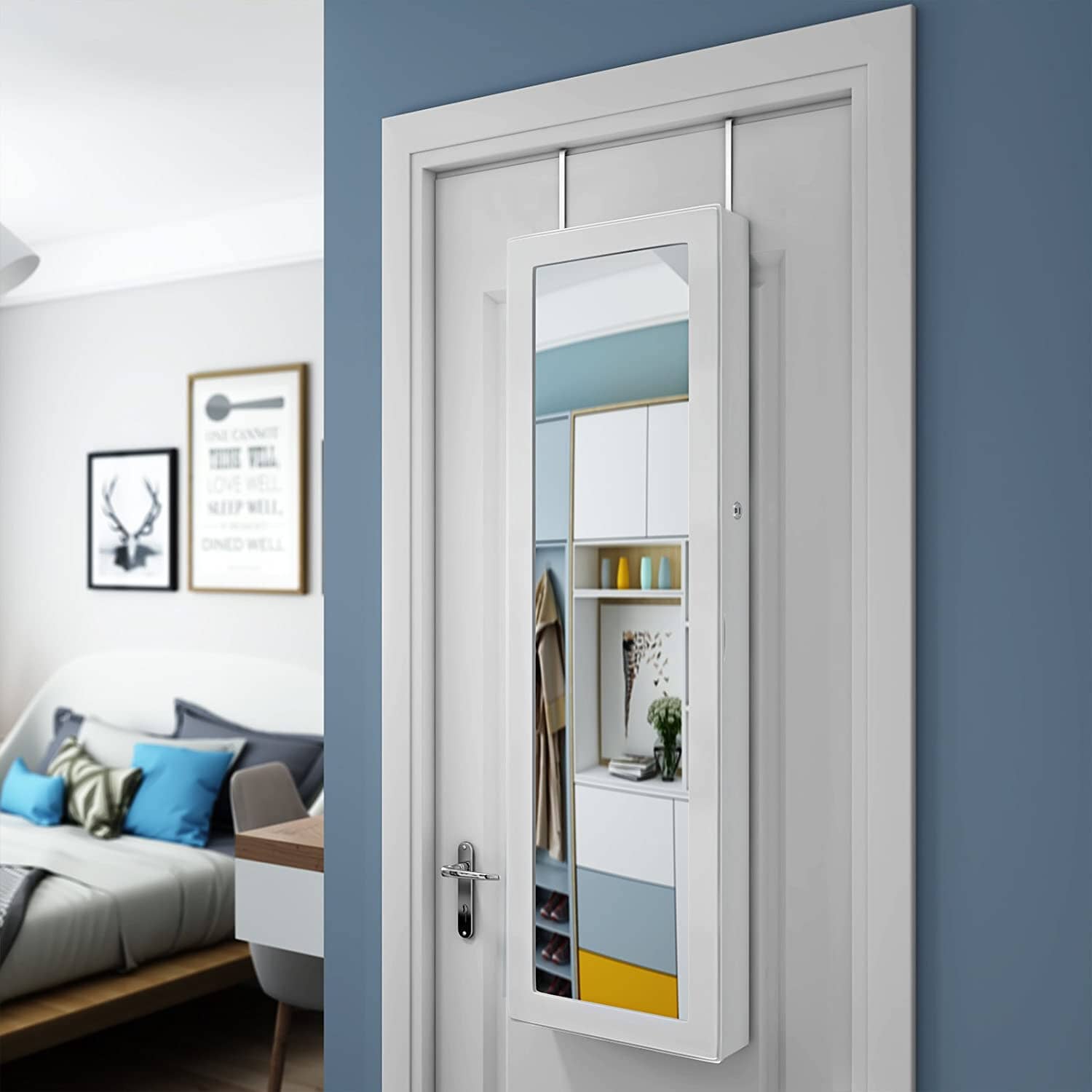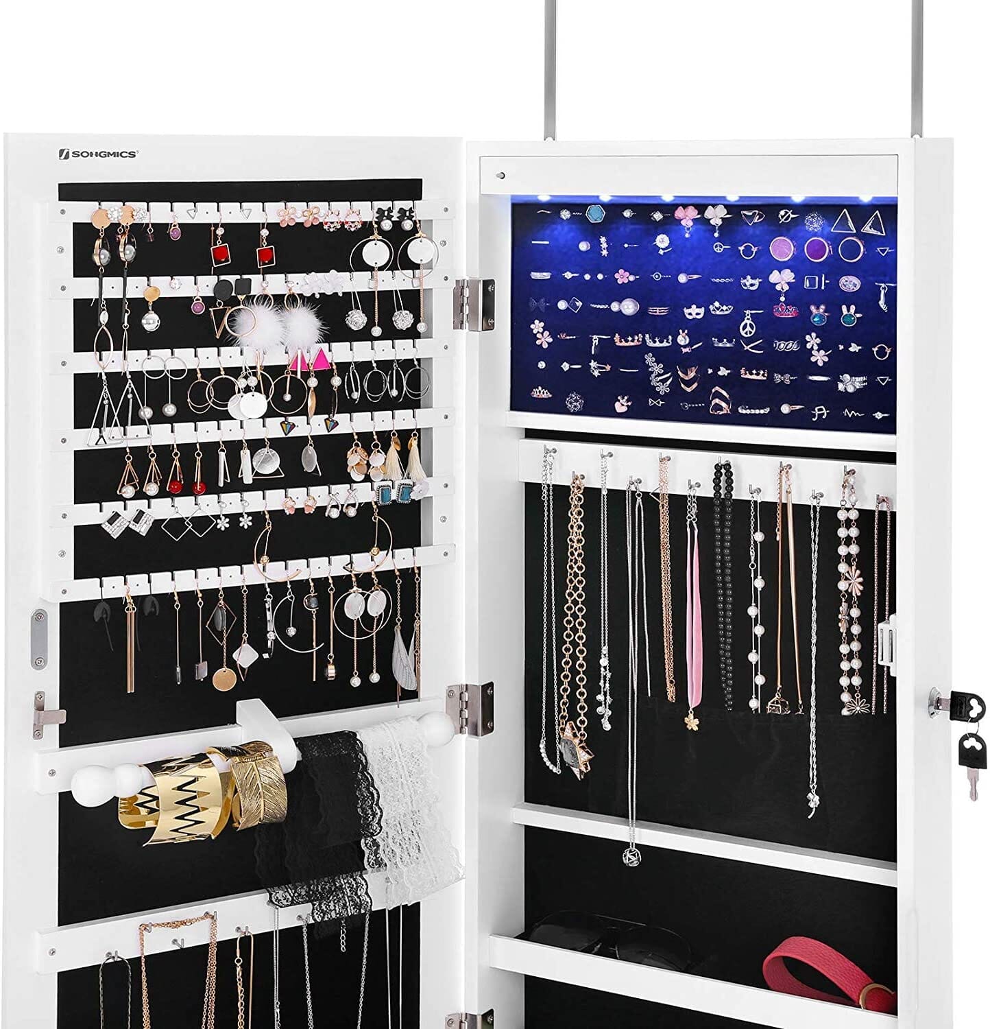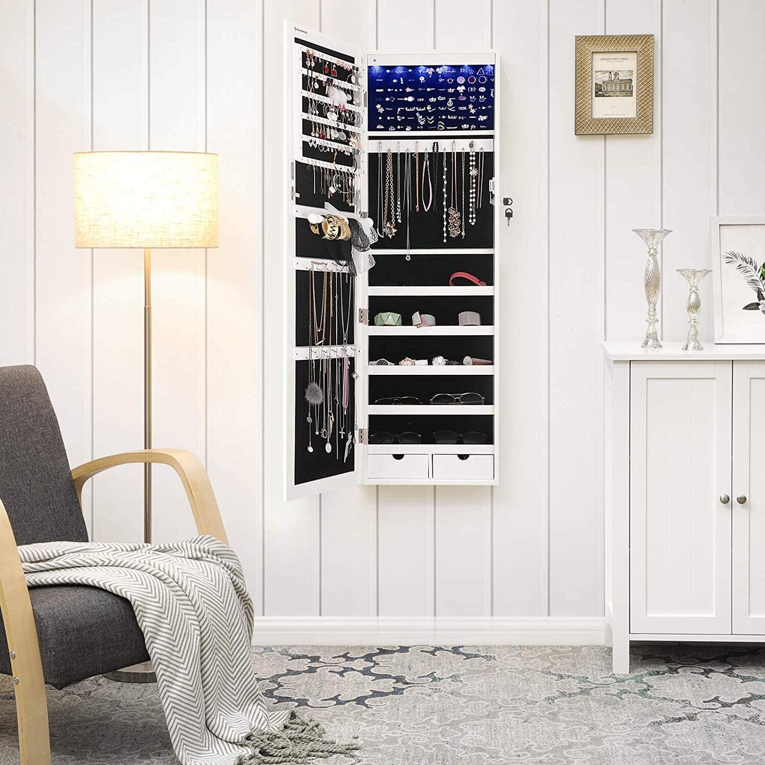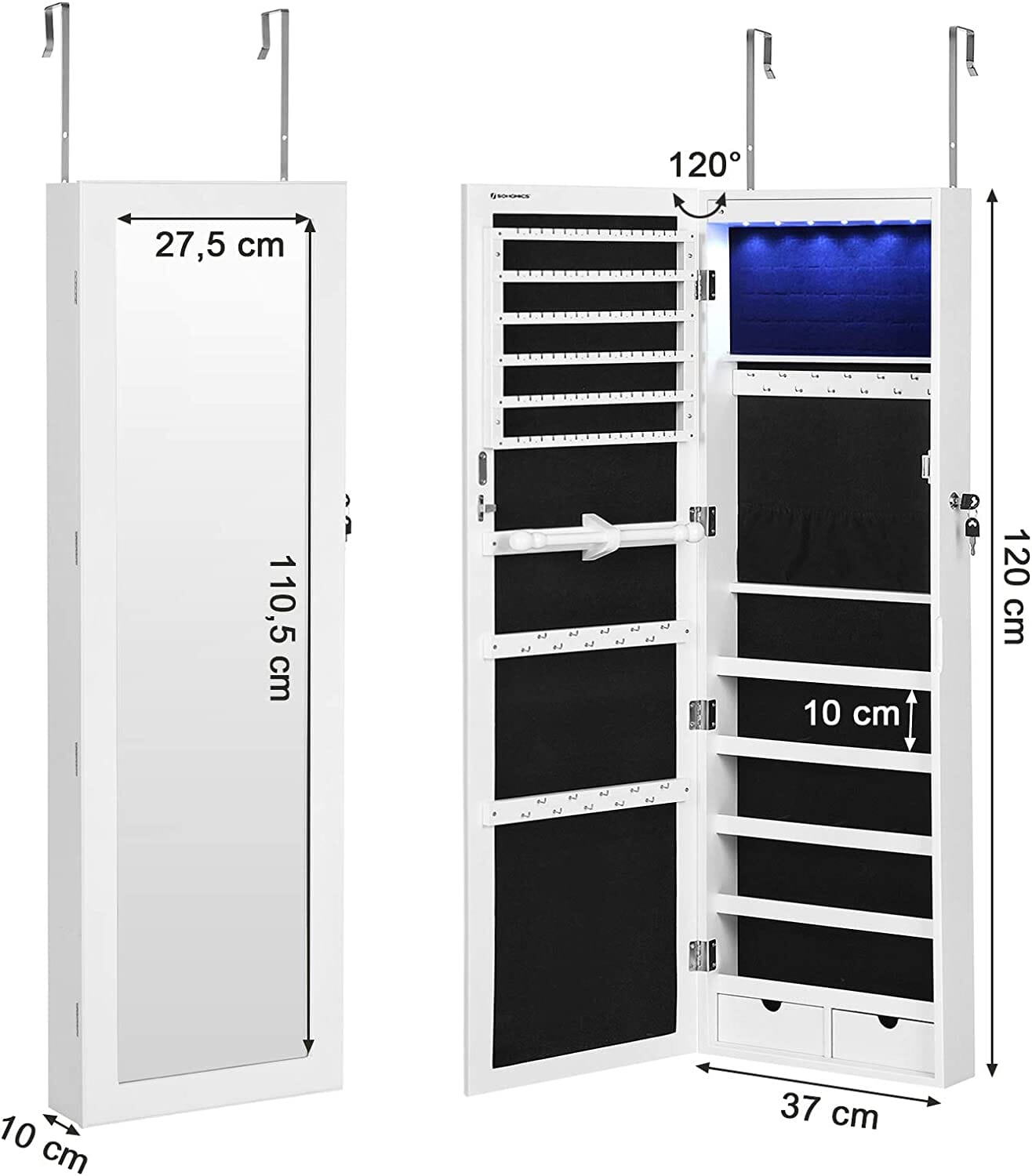 Leder du efter et elegant og sofistikeret møbel til at organisere dine dyrebare smykker? Linda smykkeskab er den perfekte tilføjelse til ethvert kvinde- eller pigesoveværelse. Dette smukke og unikke skab har et fantastisk spejl udformet med en tidløs silhuet. Når det åbnes, vil du være vidne til det ultimative skattekammer med masser af plads til øreringe, ringe og hårpynt, skuffer til parfume og kosmetik, batteridrevne LED-lys; alt sammen forberedt til at tage imod din elskede smykkesamling. Det vigtigste er, at skabet kan lukkes sikkert med magneter, der holder dørene fast lukket. Desuden kan dette skab blive en del af ethvert rum med sit praktiske design - du kan montere det på en væg eller hænge det på en dør.
