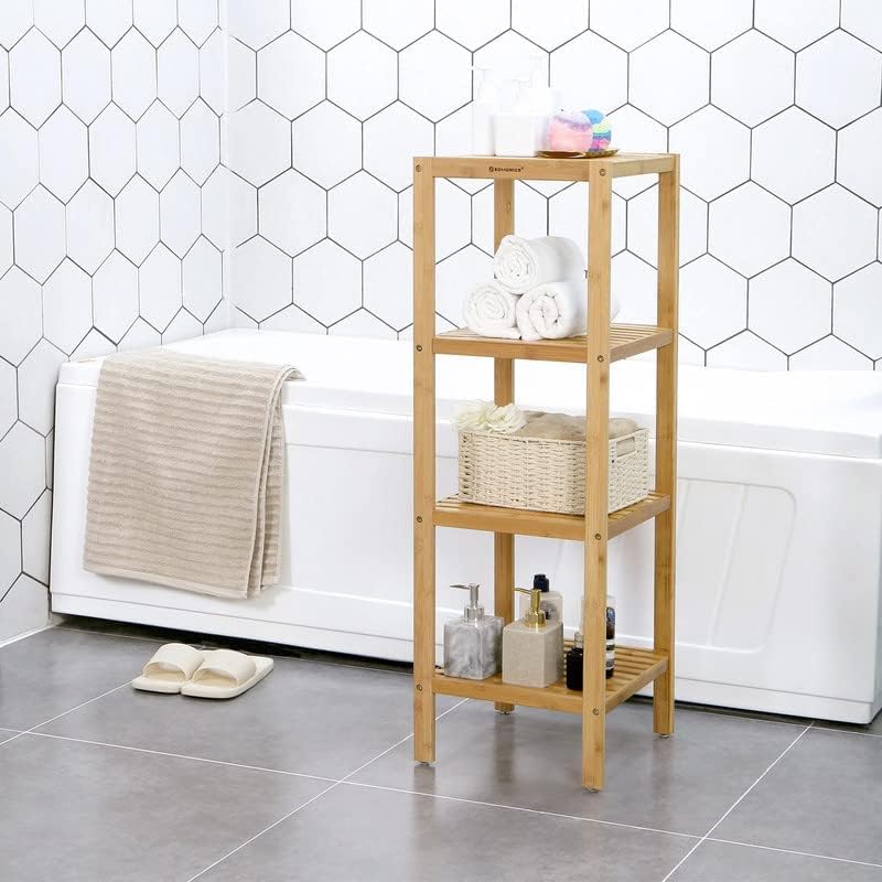 Denne reol i 100% naturlig bambus er ideel til opbevaring af badeværelsesartikler, planter, bøger, krydderier og småting. Dens kompakte design passer perfekt i både små og store rum.
