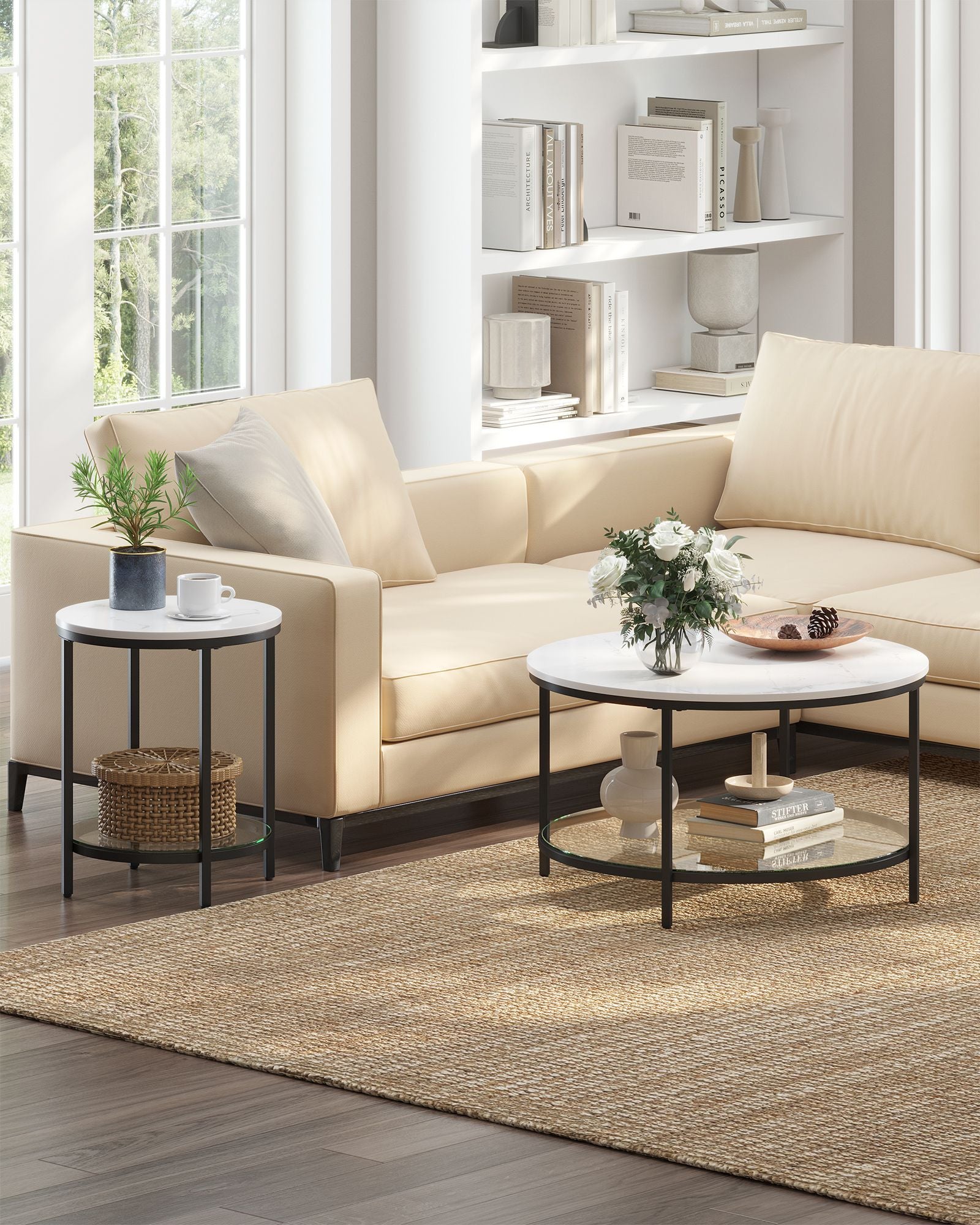 Med to åbne hylder giver dette sofabord dig mulighed for at holde dine vigtigste ejendele tæt på. Placer din kop, fjernbetjening, mobiltelefon og magasiner inden for rækkevidde, og nyd den bekvemmelighed, som dette bord tilbyder. Med sine mål på 45 x 55 cm (diameter x højde) er det det perfekte møbel til både stuen, soveværelset eller kontoret.